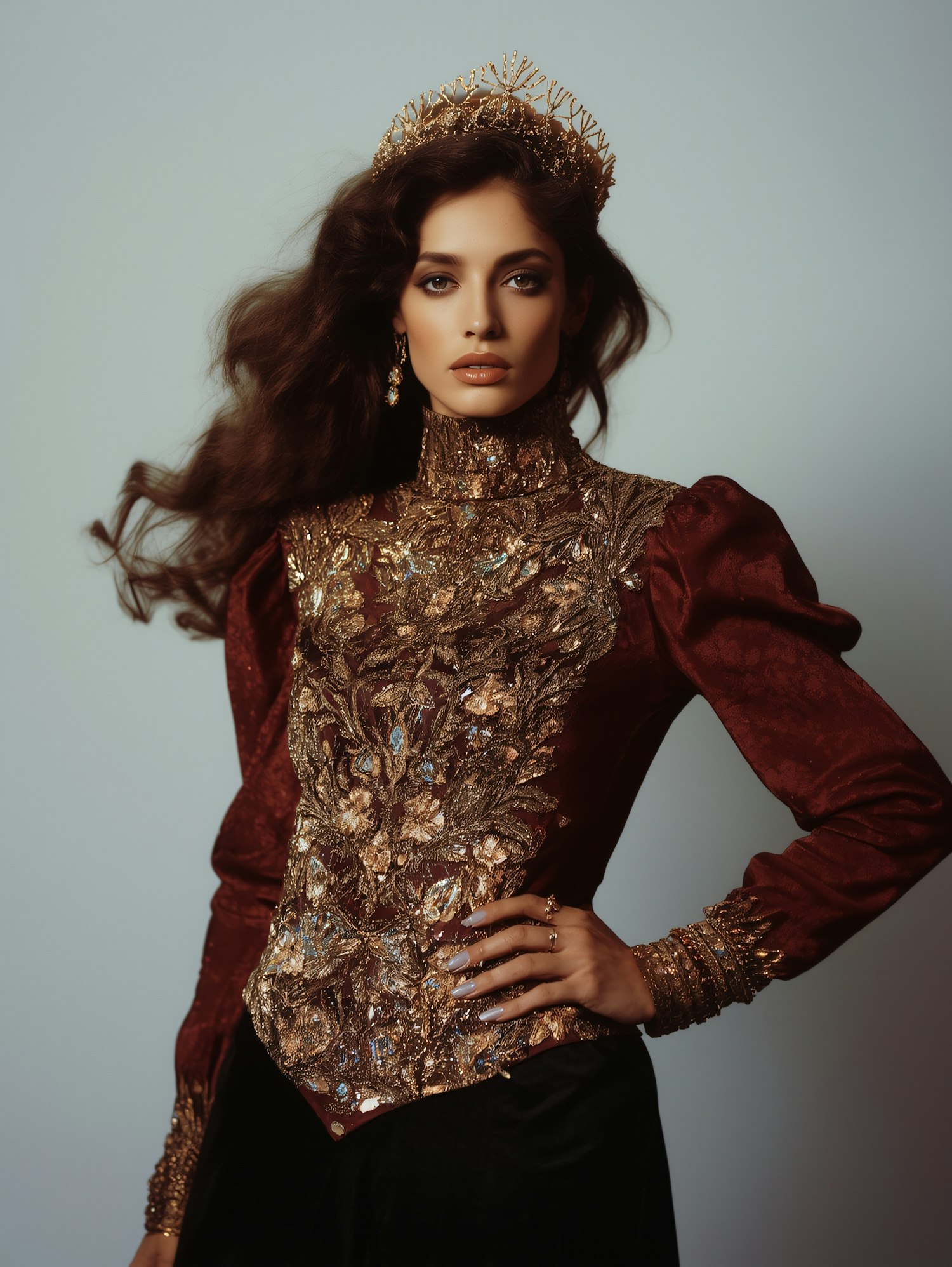 A regal woman in a burgundy and gold embroidered dress with a delicate crown, exuding elegance and sophistication.