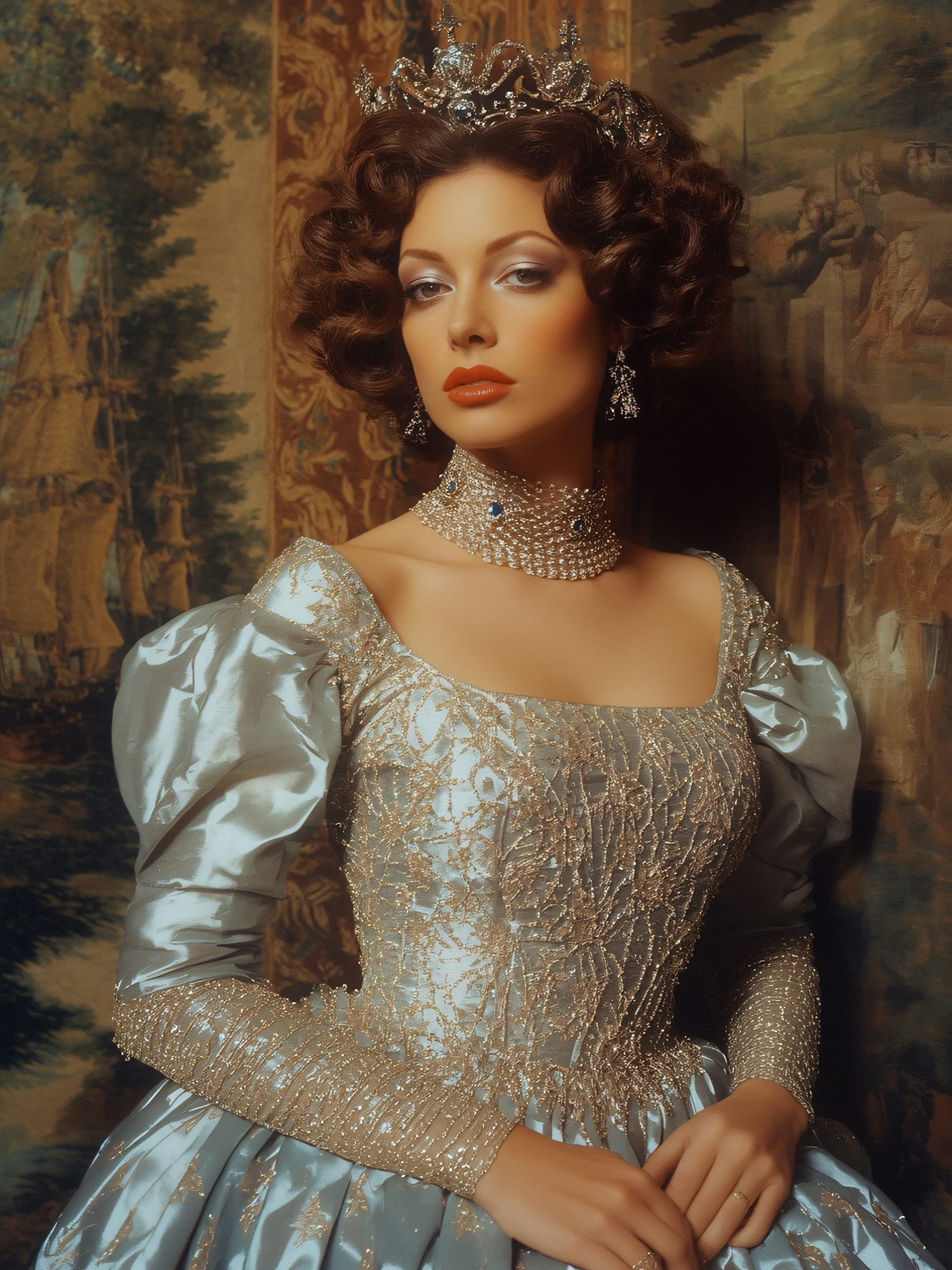A regal woman in a silver gown with intricate details, wearing a jeweled crown and elegant accessories, set against a classical tapestry.
