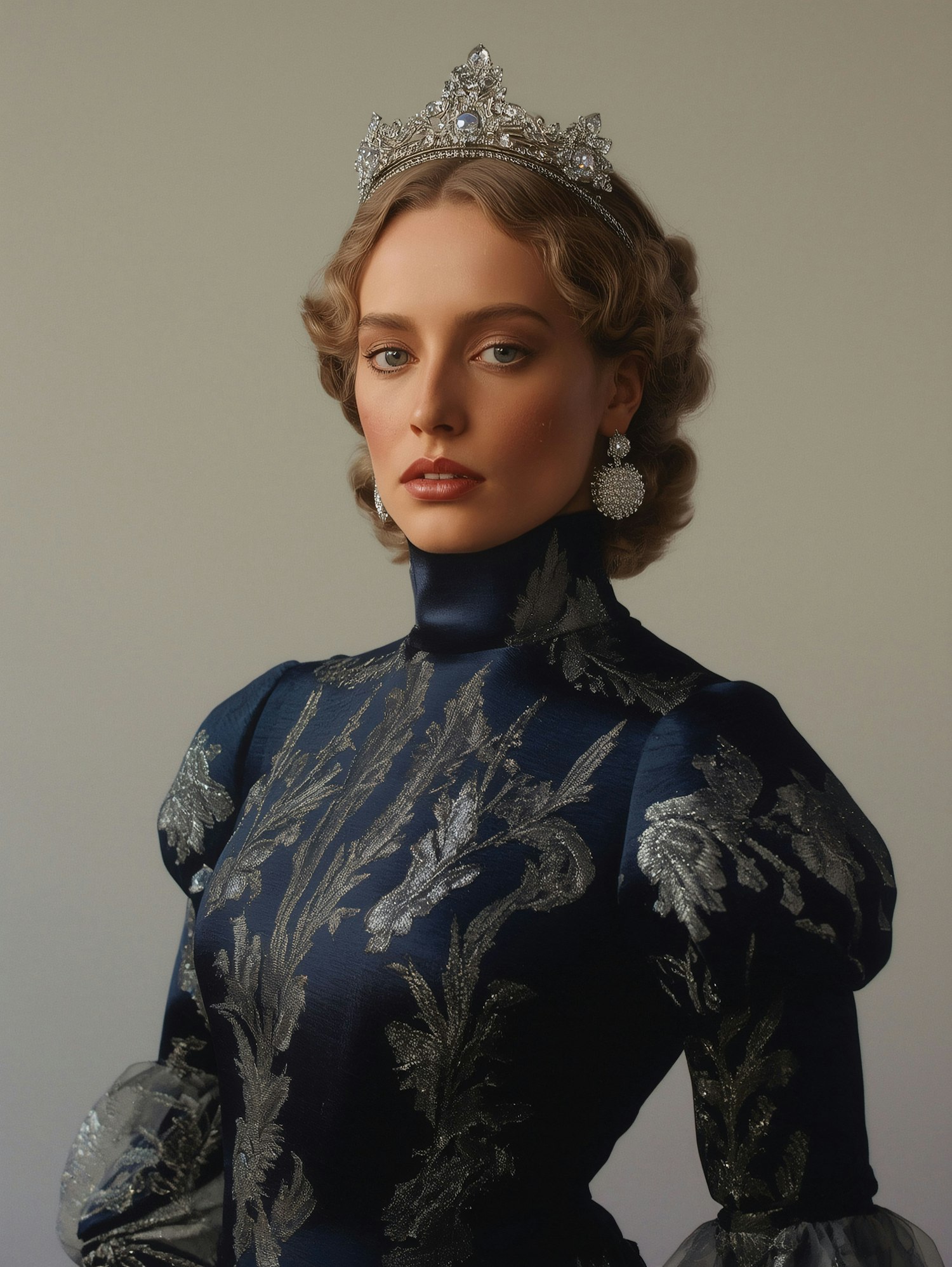A regal woman in a silver crown and embroidered blue gown, exuding elegance and sophistication against a neutral backdrop.