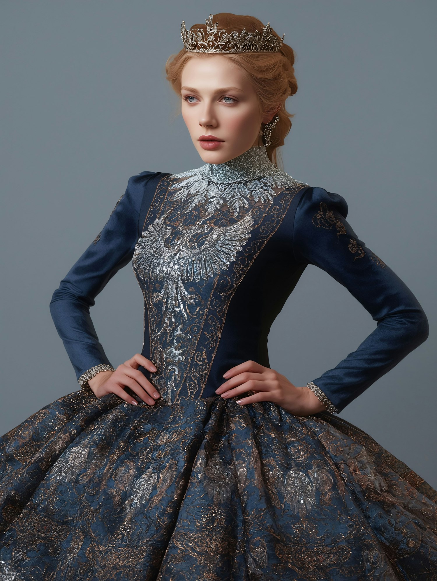 A regal woman in a blue and silver gown with a crown, exuding elegance and sophistication against a neutral background.