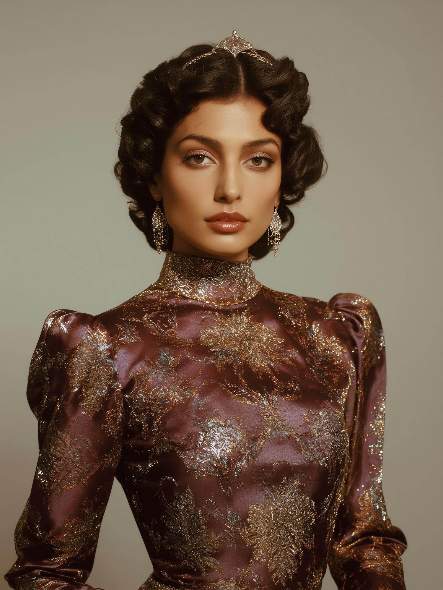A regal woman in a purple and gold gown with a tiara and elegant earrings, exuding sophistication against a neutral background.