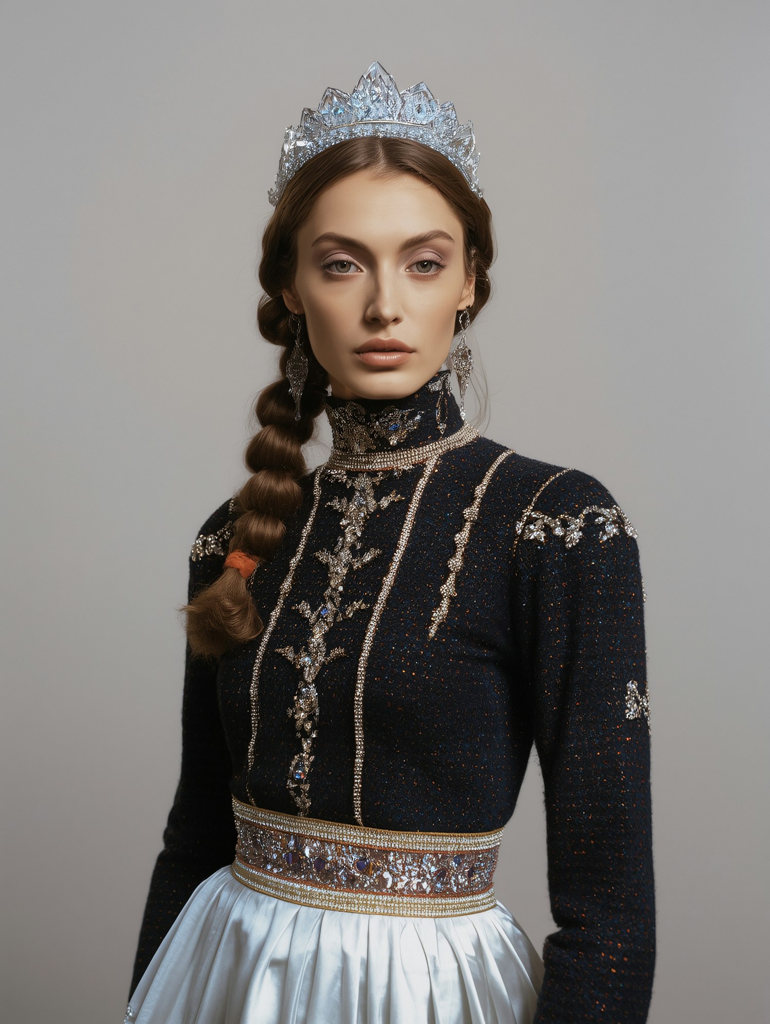 A regal woman in an ornate outfit with a crystal crown and intricate embroidery, exuding elegance and sophistication.