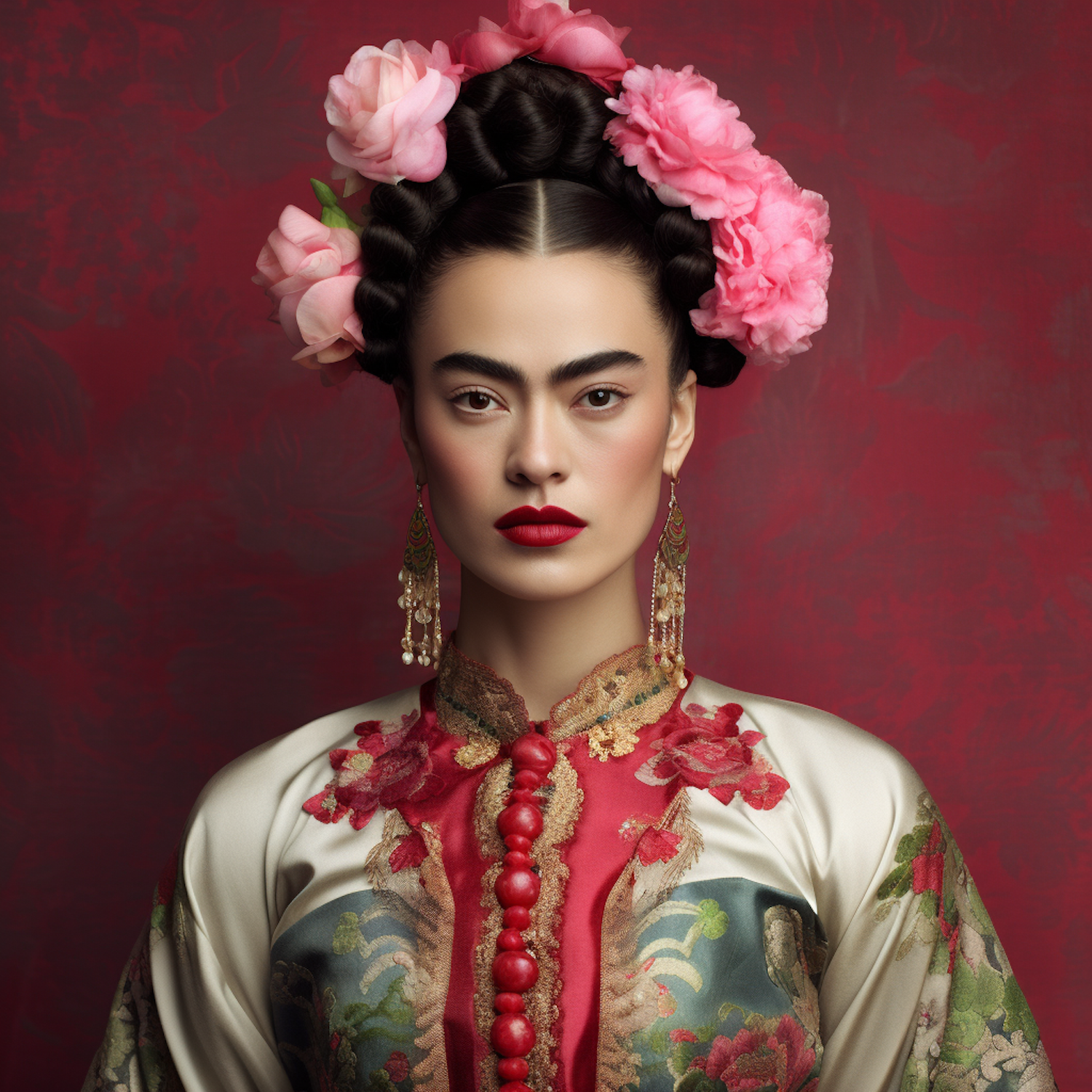 Elegant portrait of a woman with floral hair adornments, bold red lips, and ornate embroidered attire against a deep red backdrop.