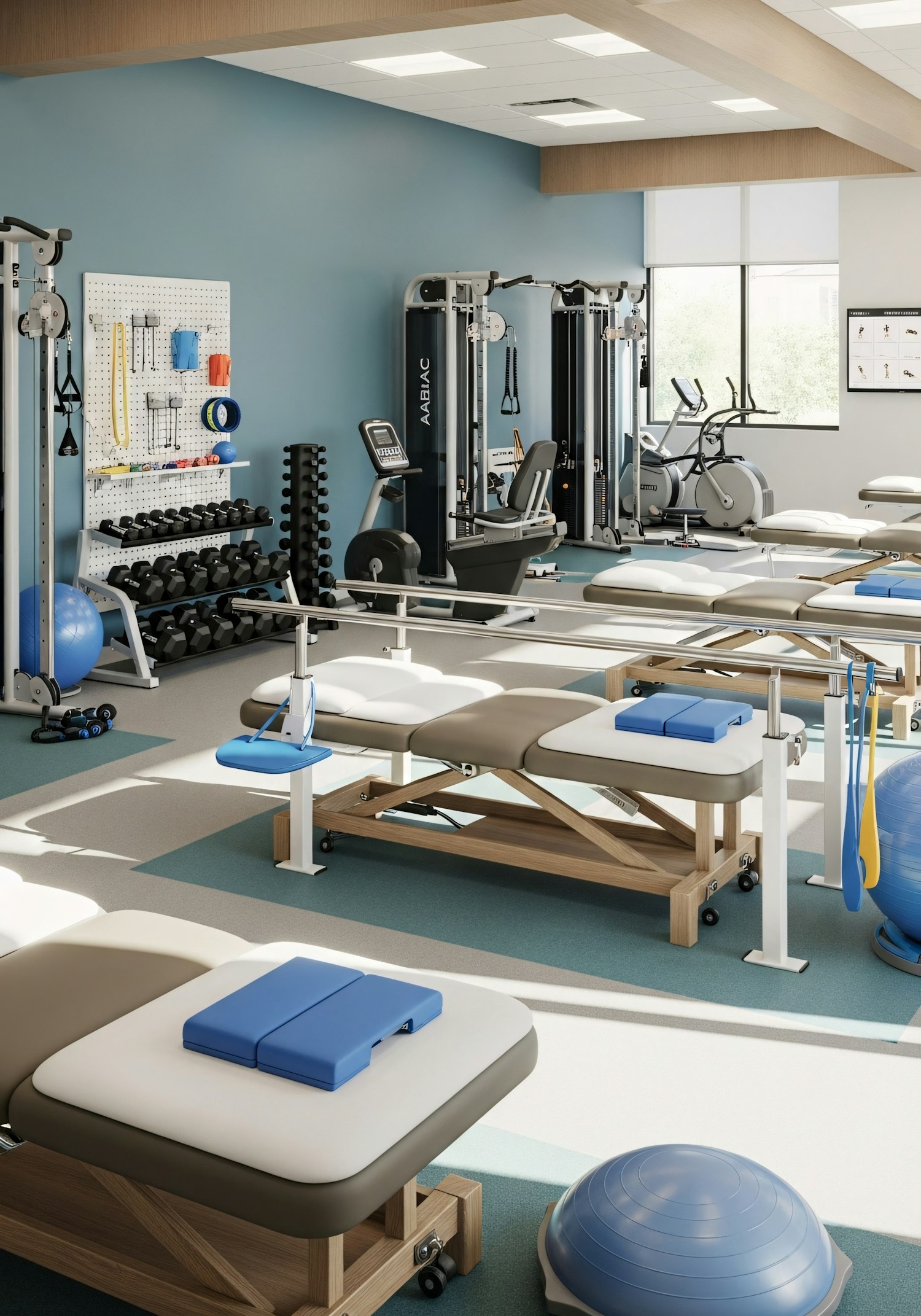 Bright and modern physical therapy center with treatment tables, exercise equipment, and a clean, organized layout.