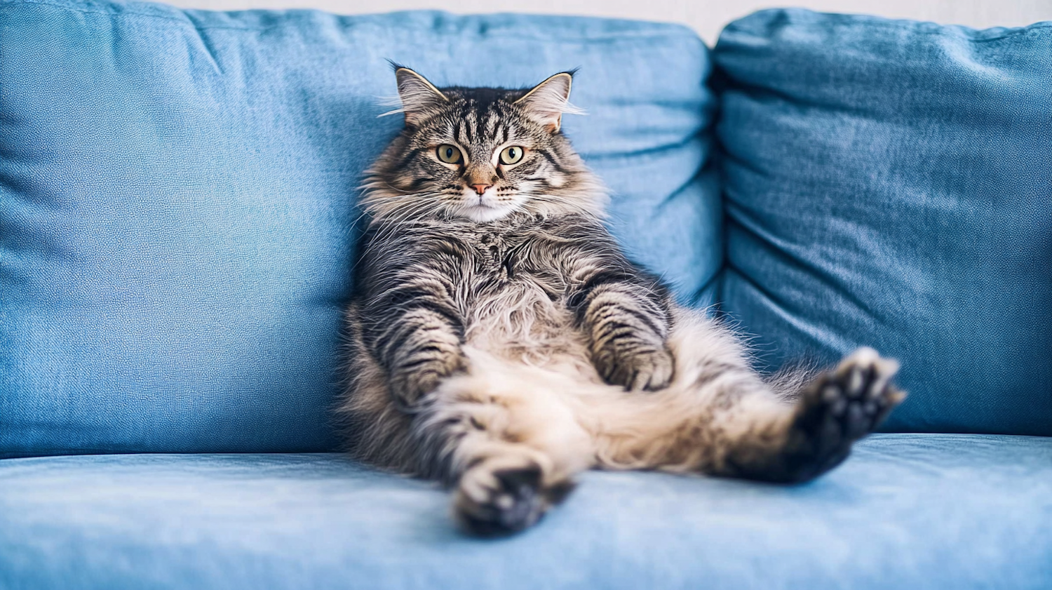 Fluffy tabby cat lounging on a bright blue couch, sitting upright with an alert expression and striking green eyes.