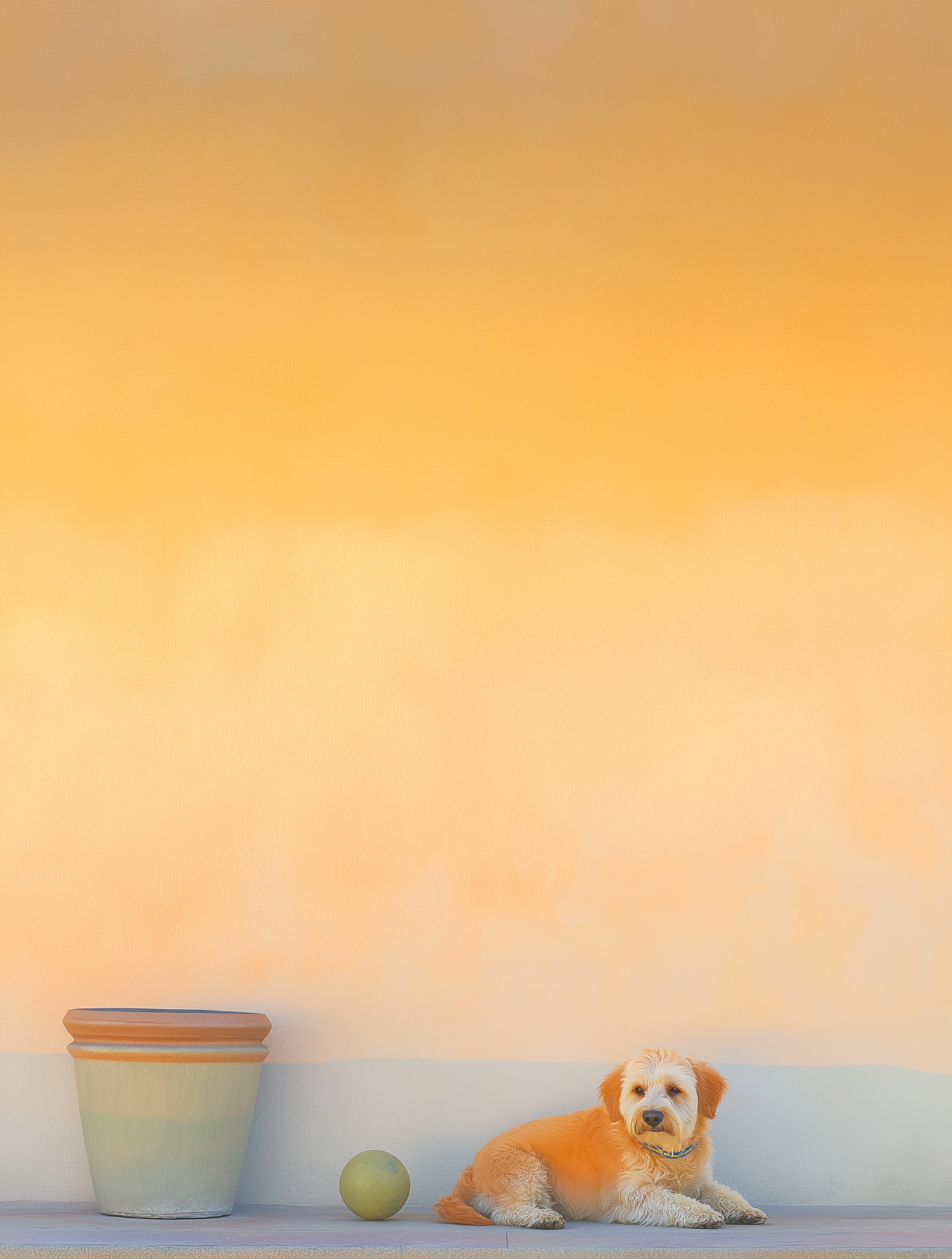 Fluffy dog resting beside a flower pot and green ball against a warm orange-yellow gradient background.