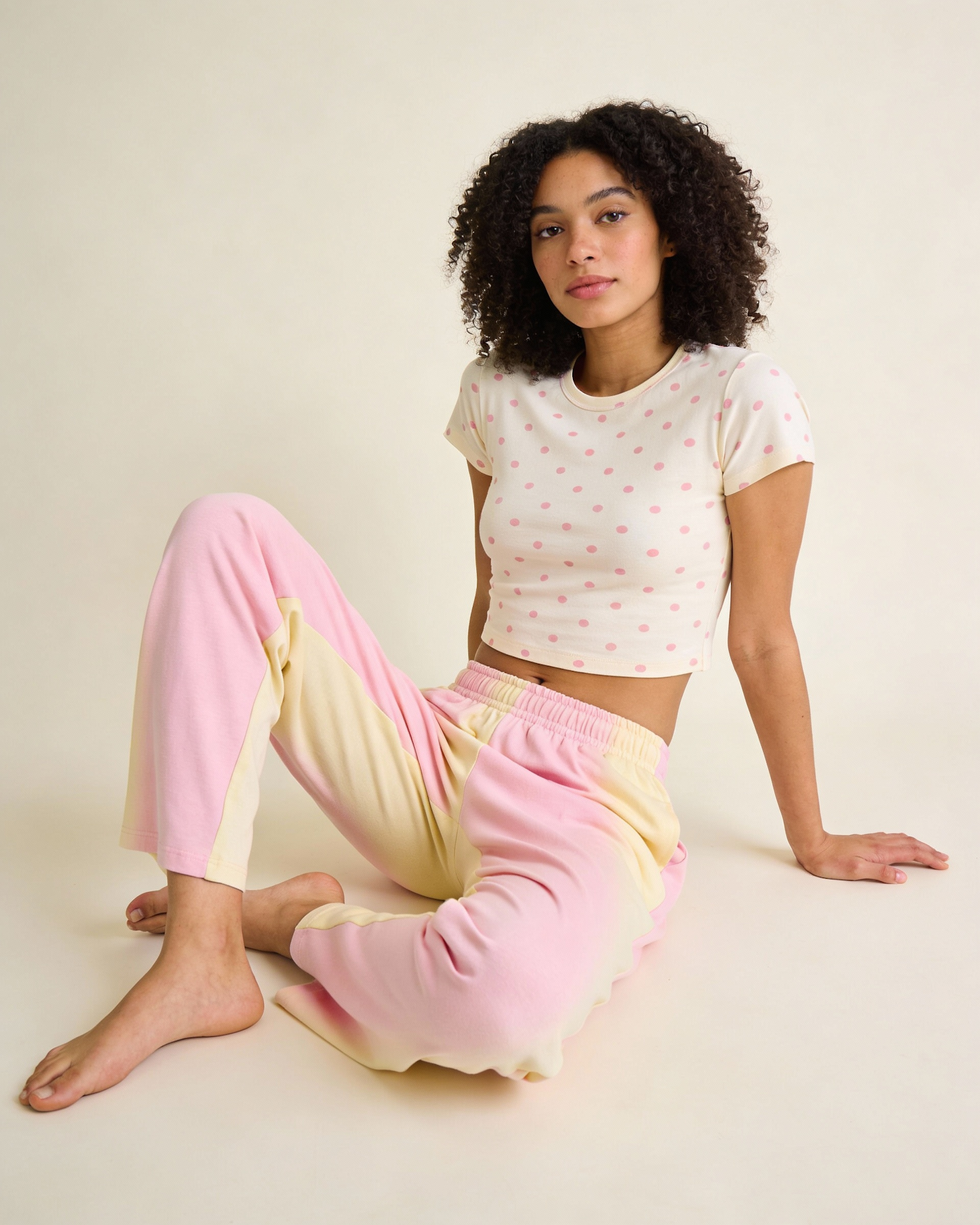 A young woman in a polka dot crop top and pastel gradient sweatpants sits on a light background, exuding a relaxed and casual vibe.