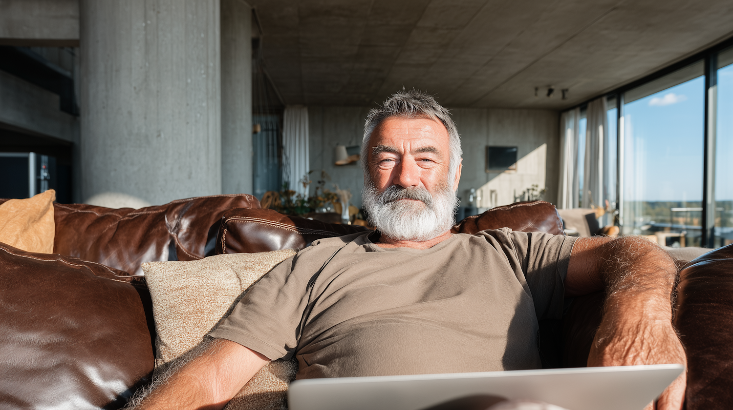A relaxed man with a white beard sits on a leather couch in a modern living room, enjoying natural light from large windows.