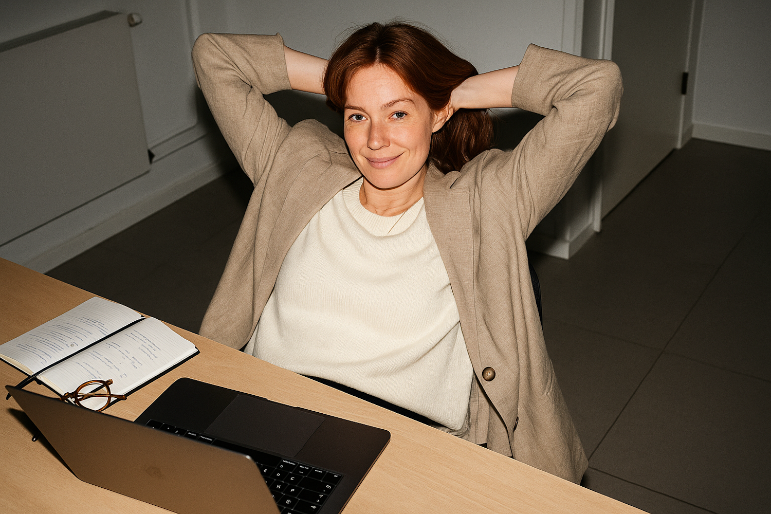 A relaxed woman in a beige blazer sits at a desk with a laptop and notebook, exuding a calm and professional vibe.