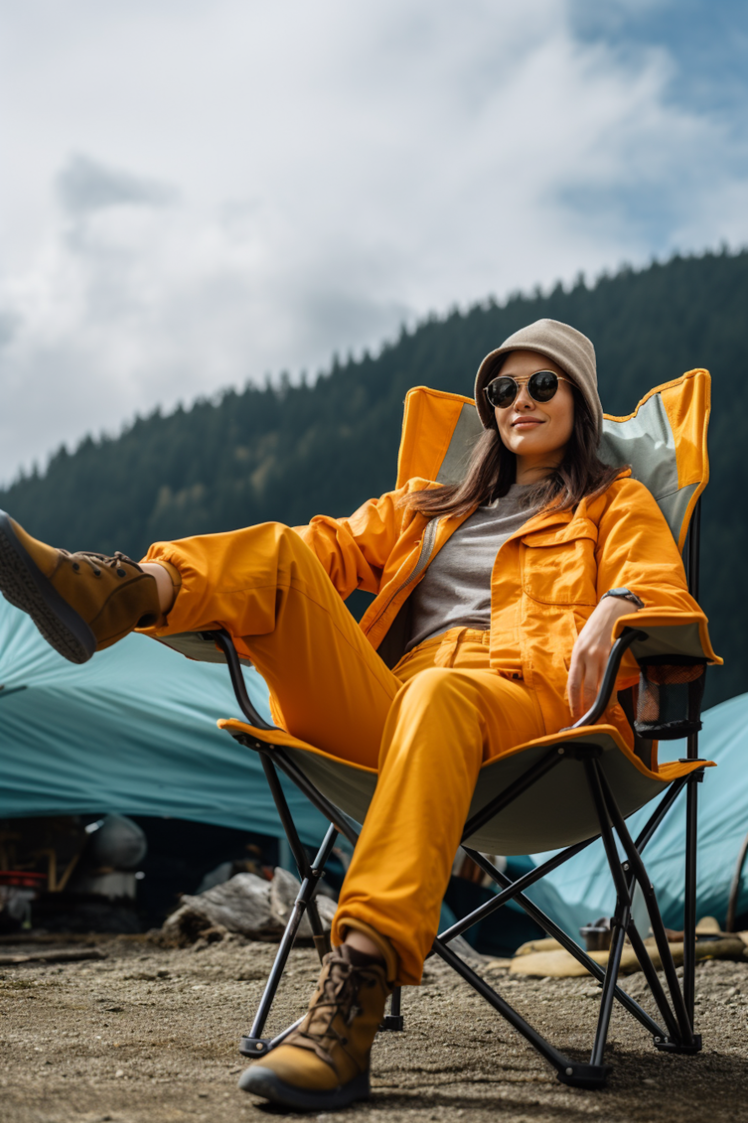 Woman in orange outfit relaxing in a camping chair with mountains in the background, wearing sunglasses and a beanie.