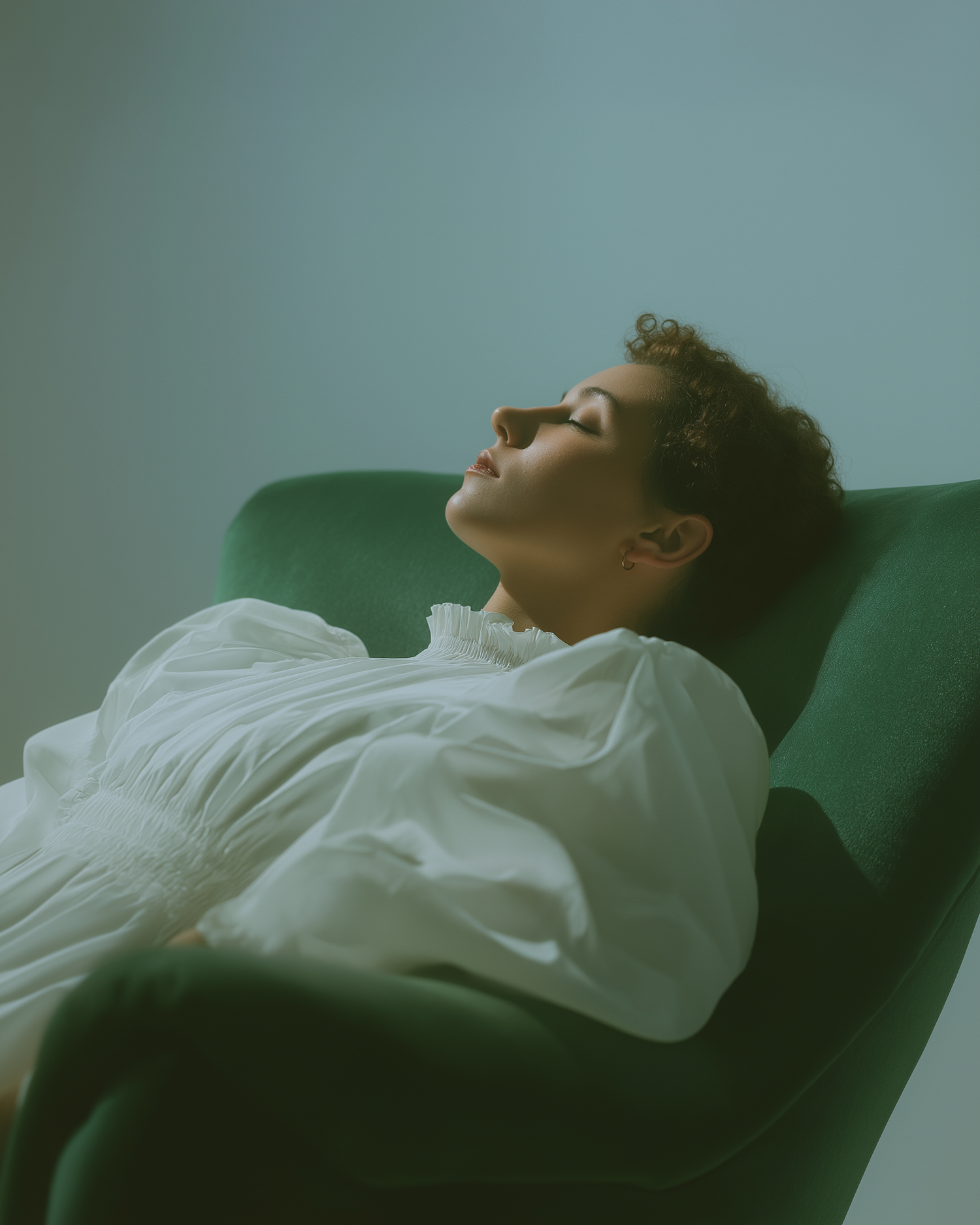 A relaxing scene of an individual resting peacefully on a green chair, wearing a white blouse, exuding minimalist aesthetic vibes.