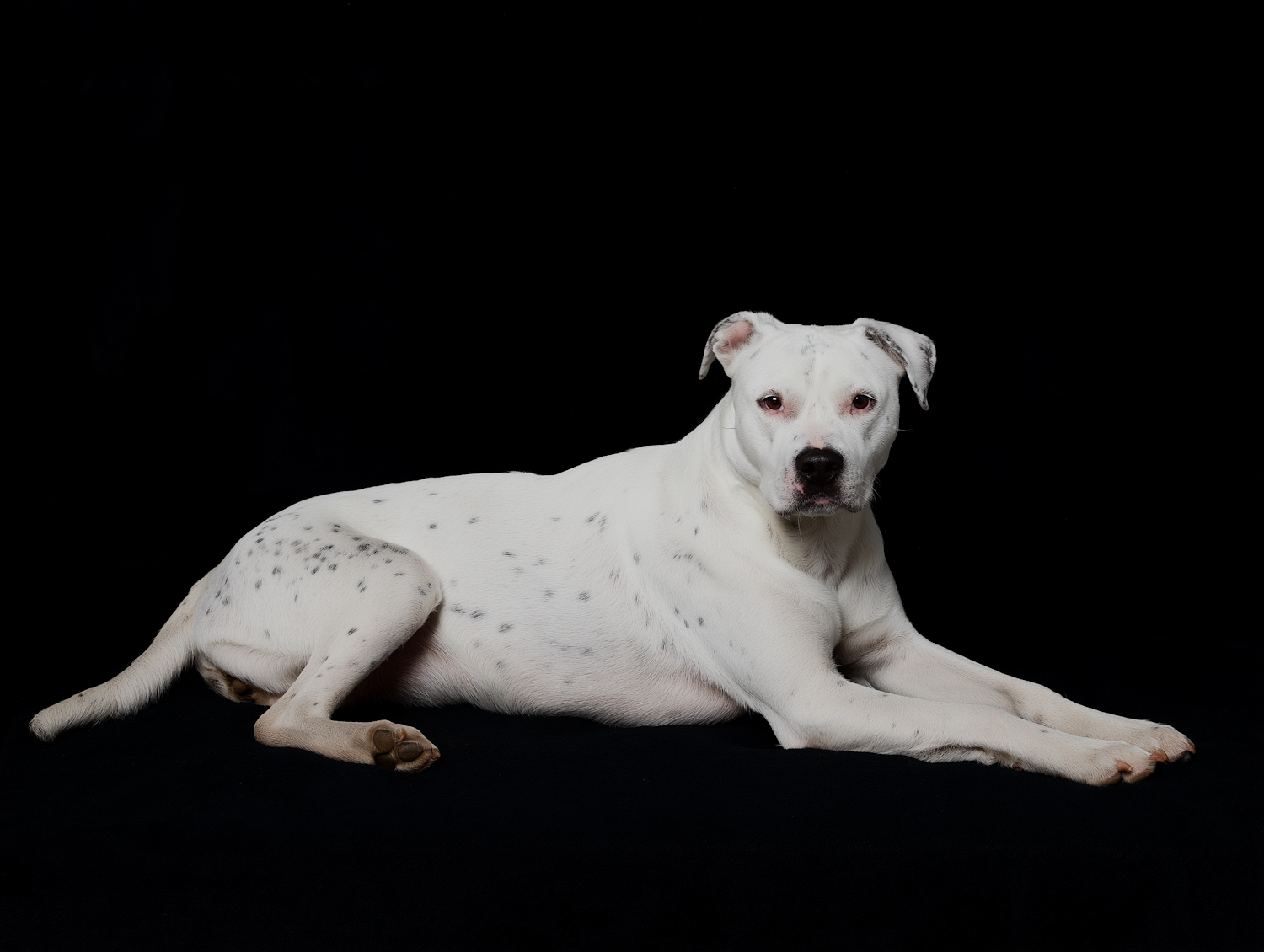 Cute Dogo Argentino dog with black spots, resting peacefully on a dark background.