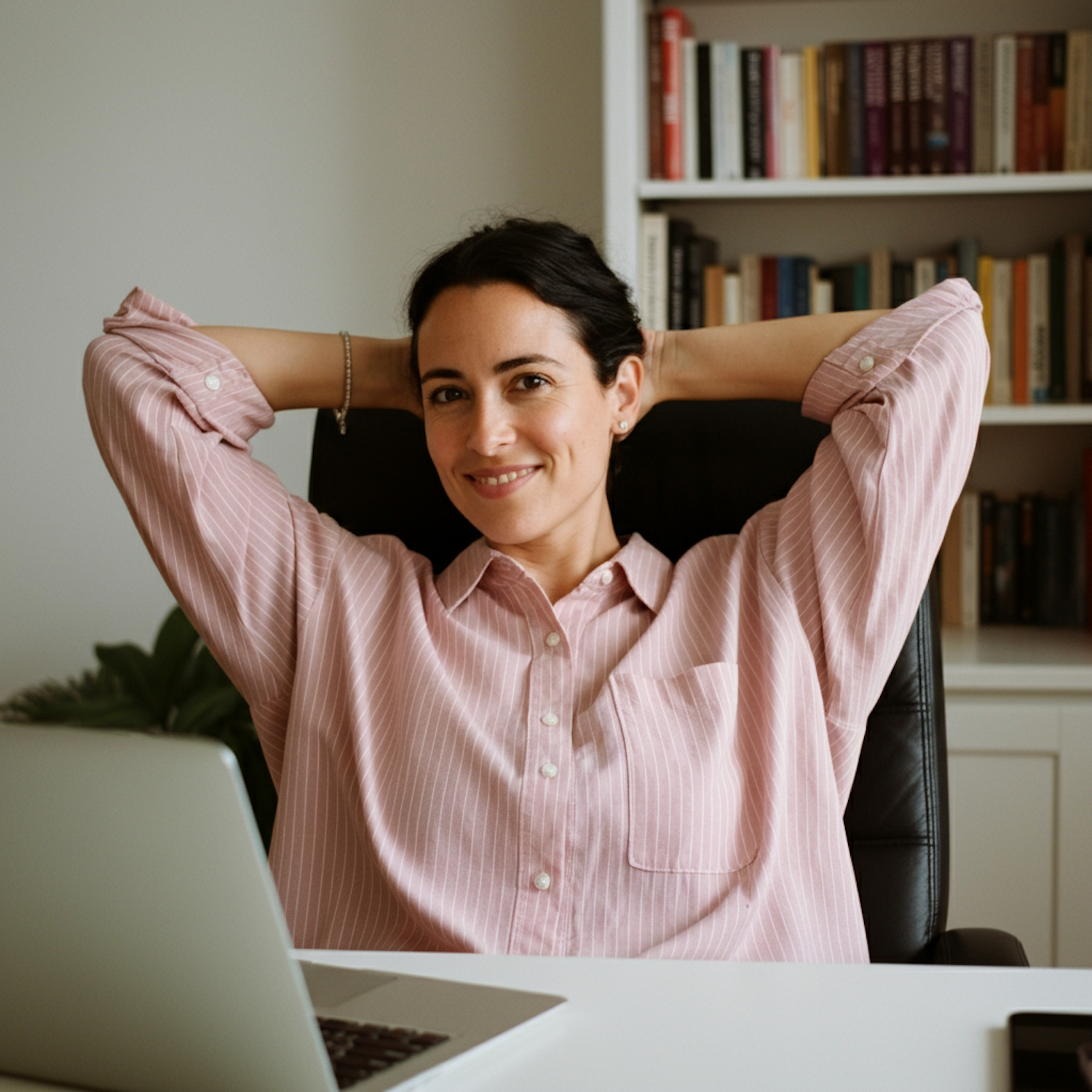 A relaxed woman in a pink shirt sits at a desk with a laptop, smiling warmly, with a bookshelf in the background.