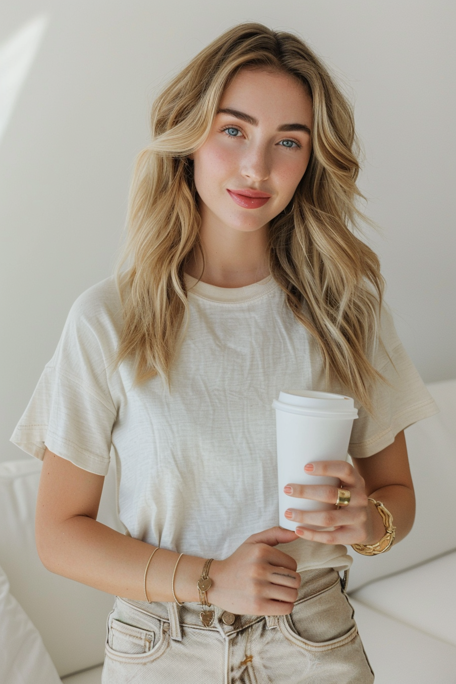 Blonde woman with blue eyes holding a coffee cup, wearing a white t-shirt and gold jewelry, in soft natural lighting.