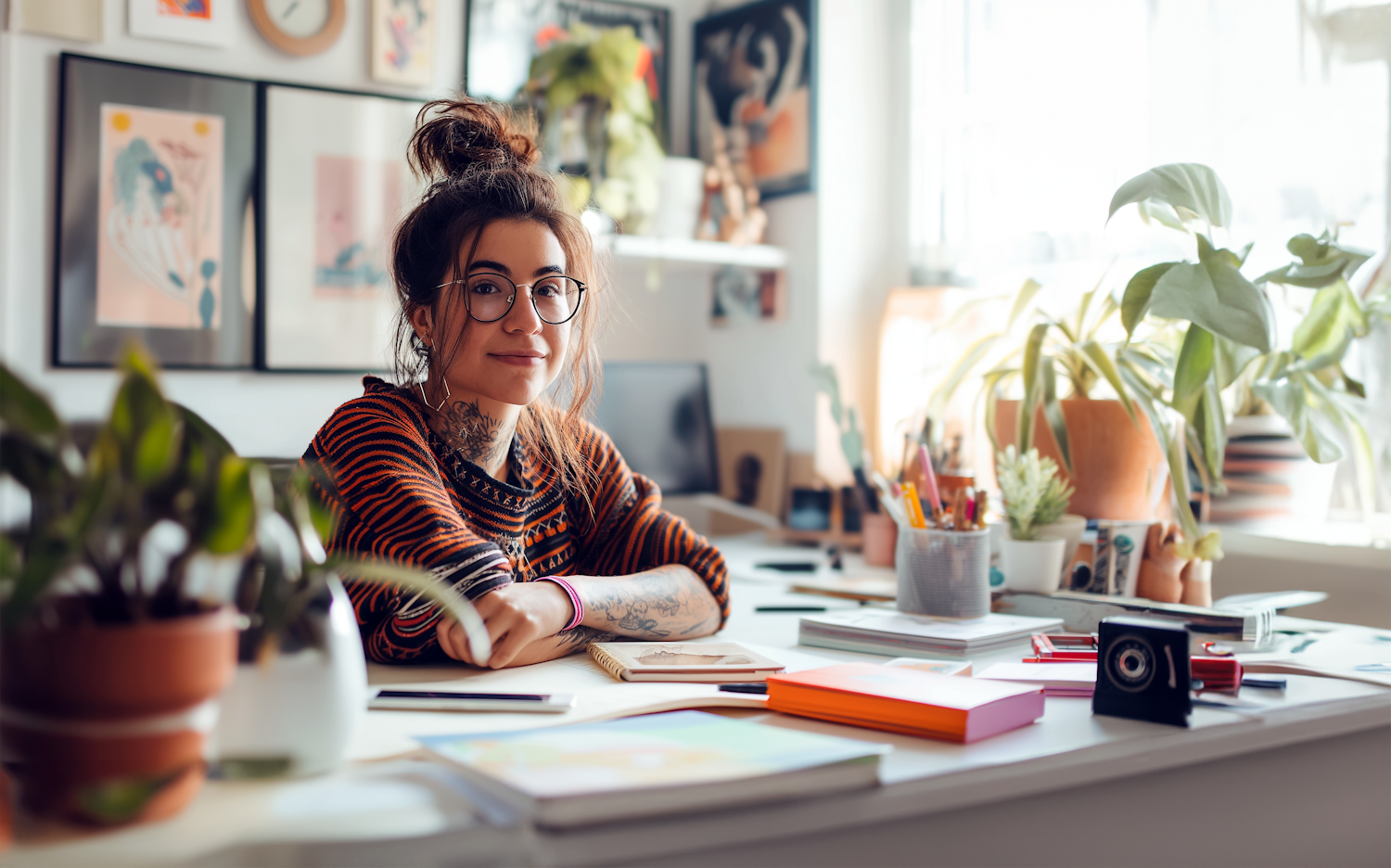 Young woman with glasses and tattoos in a cozy, artistic workspace filled with plants and art. Bright and inviting atmosphere.