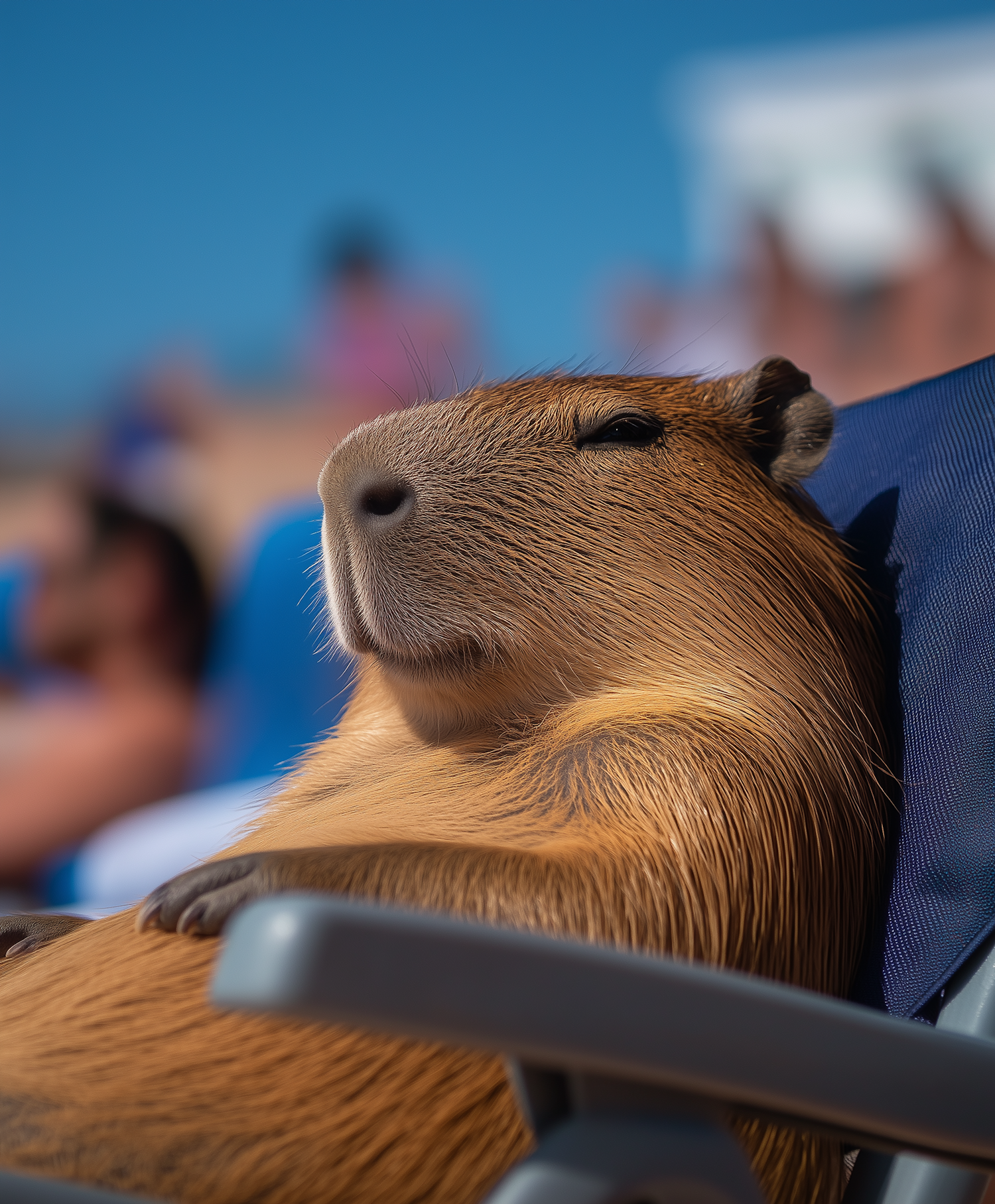 A relaxed capybara lounging on a blue chair under a sunny sky, with a blurred background of people enjoying a sunny day.