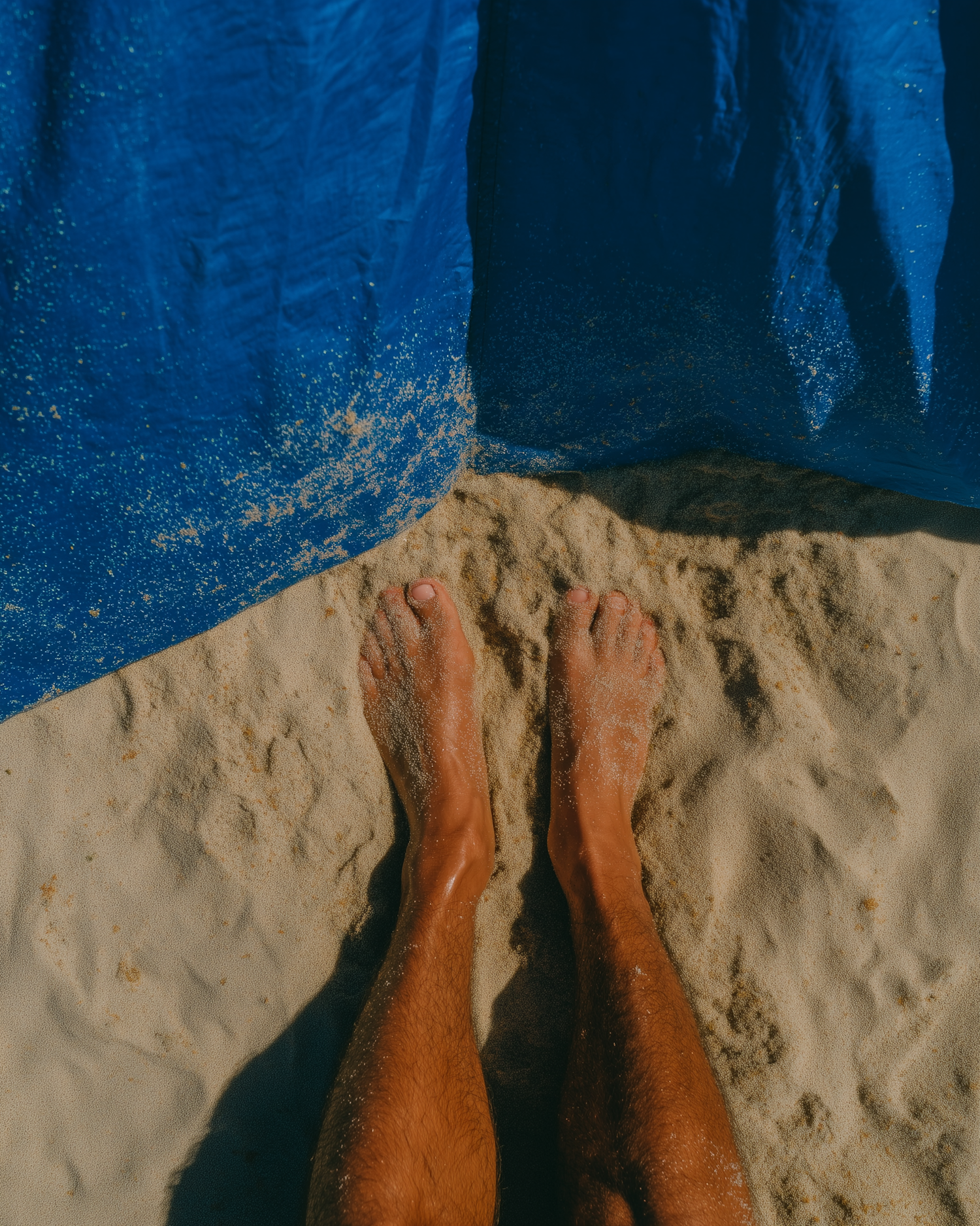 Tanned legs resting on sandy ground with a blue curtain in the background, evoking a relaxed beach vibe under sunny skies.