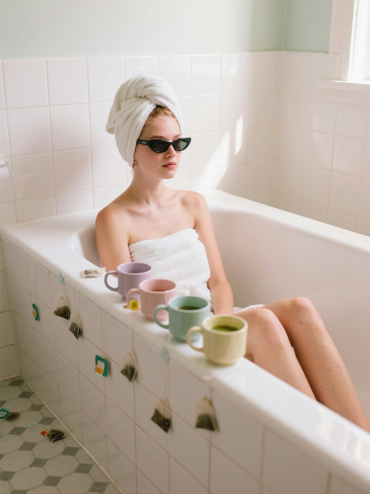 editorial-style indoor photography, soft natural light, pastel tones, candid Gen Z aesthetic, bright minimal background, warm vintage-inspired color grading, shallow depth of field, shot on a high-quality DSLR girl sitting in an empty bathtub with a towel wrapped around her head, sunglasses on, surrounded by matcha mugs and scattered tea bags on the tiled wall, ironic spa day vibe