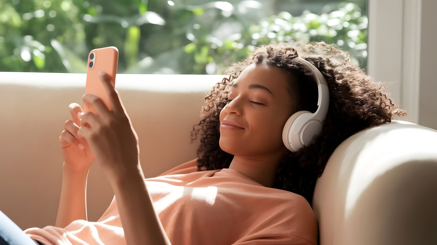 Relaxed woman with curly hair enjoying music on white headphones while using a peach smartphone, lounging on a couch in natural light.