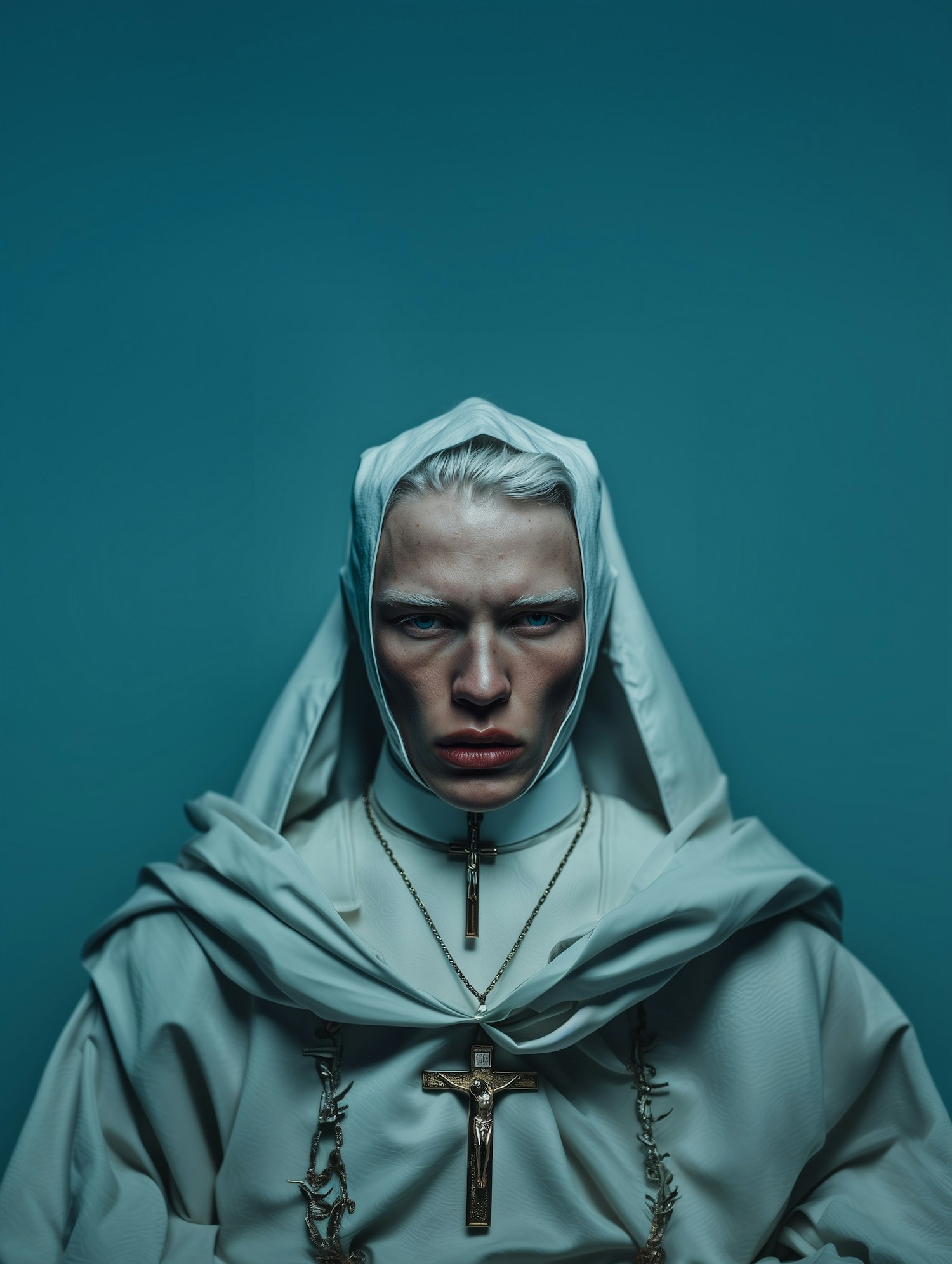 A person in a white religious habit with crucifix necklaces, set against a teal background, exudes a solemn and dramatic presence.