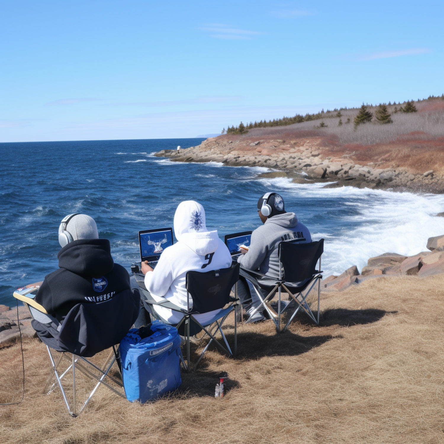 Three people with laptops and headphones work on a cliffside overlooking the ocean, blending technology with nature's beauty.