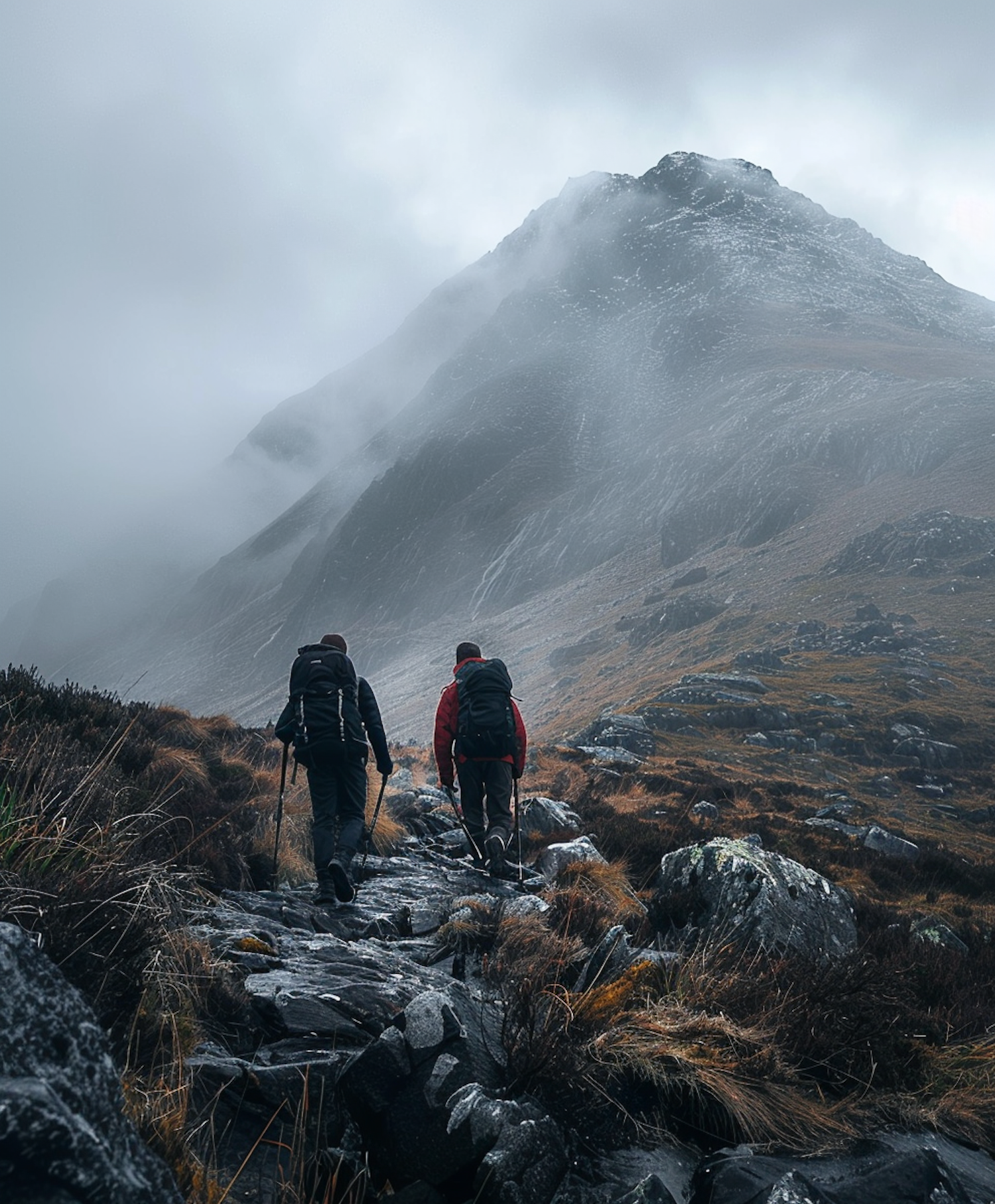 Two hikers trek up a misty mountain path, surrounded by rugged terrain and low clouds, creating a moody and adventurous atmosphere.