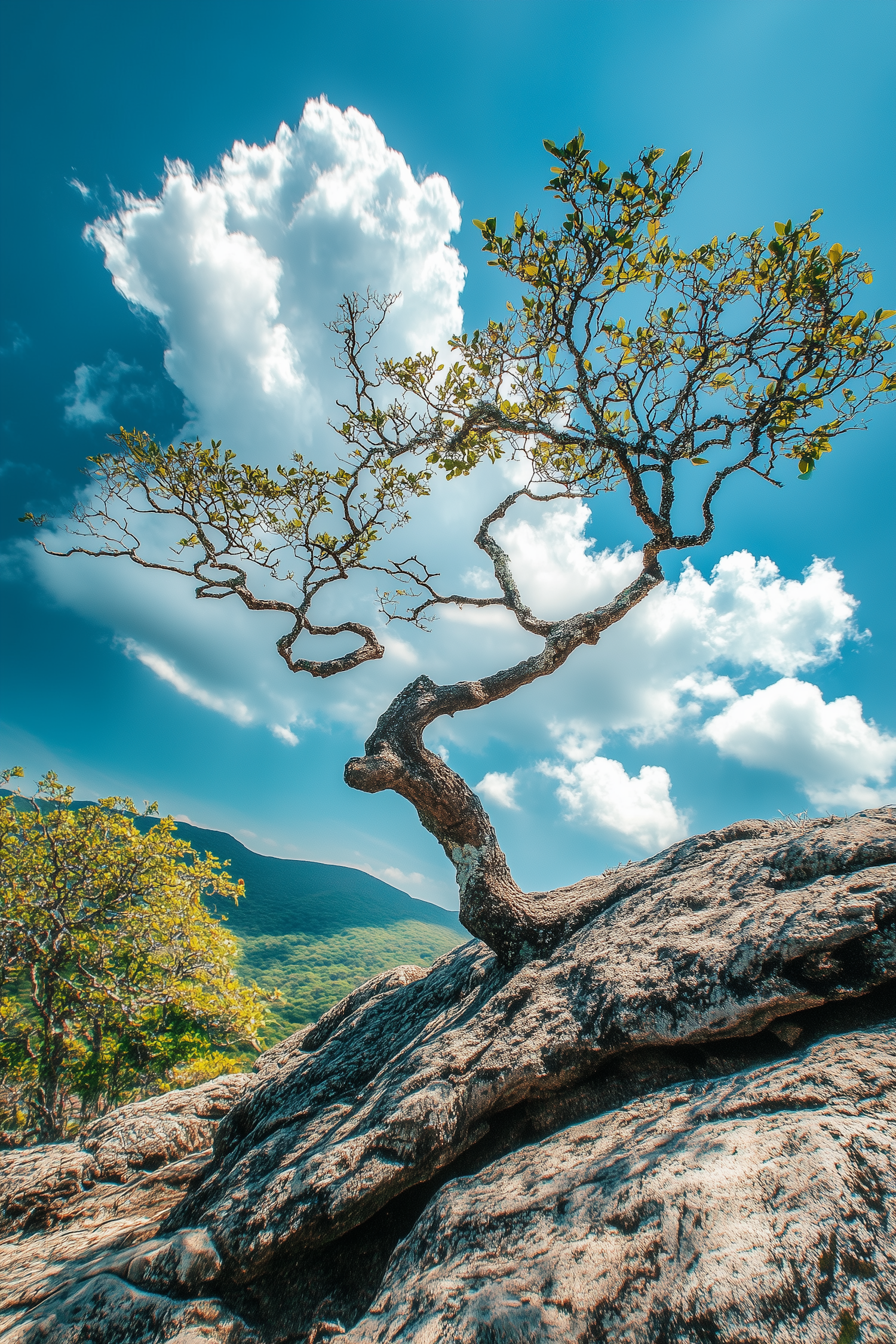 Twisted tree on rugged rocks under a vibrant blue sky with fluffy clouds, set against a lush green landscape.