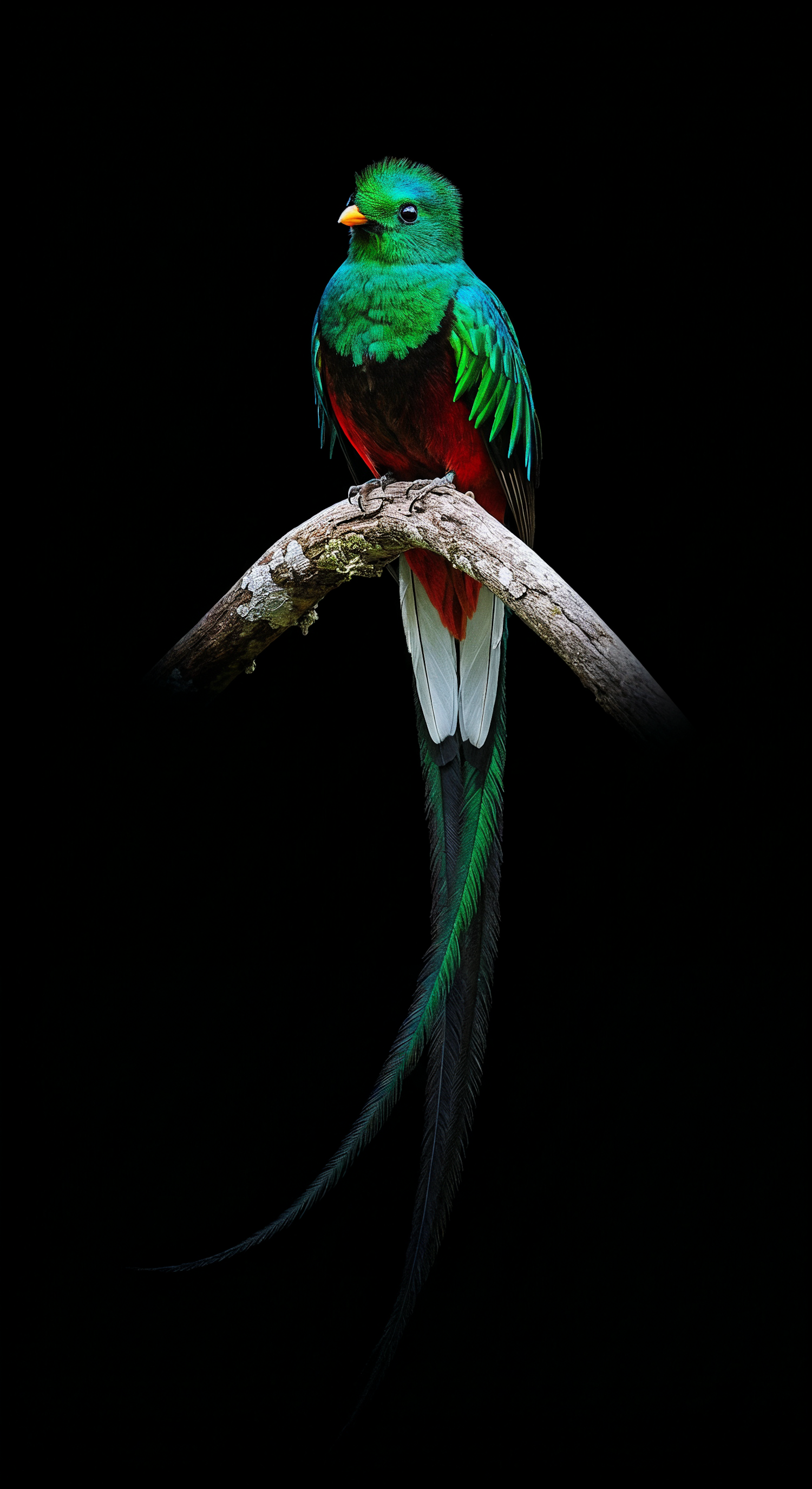 A stunning resplendent quetzal with vibrant green and red plumage perched on a branch, set against a dramatic black background.