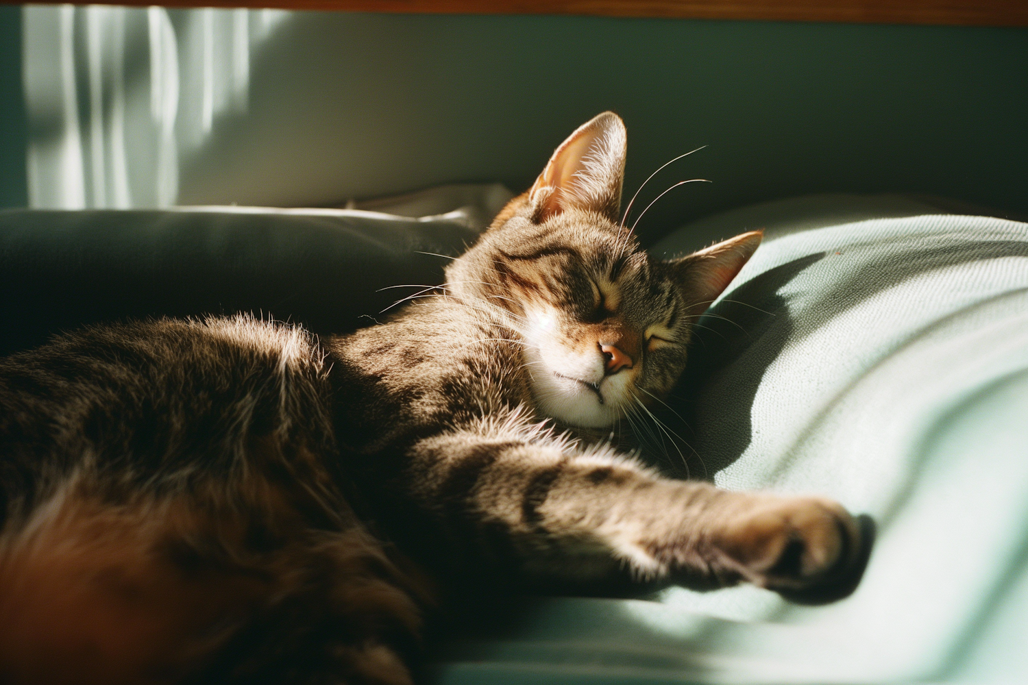 A tabby cat sleeps peacefully in sunlight on a soft green surface, with its paw stretched out and eyes closed in tranquility.