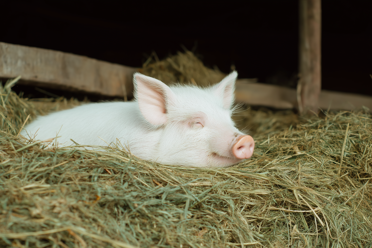 A piglet sleeping on a cozy bed of straw in a barn, with its white fur contrasting against the natural background.