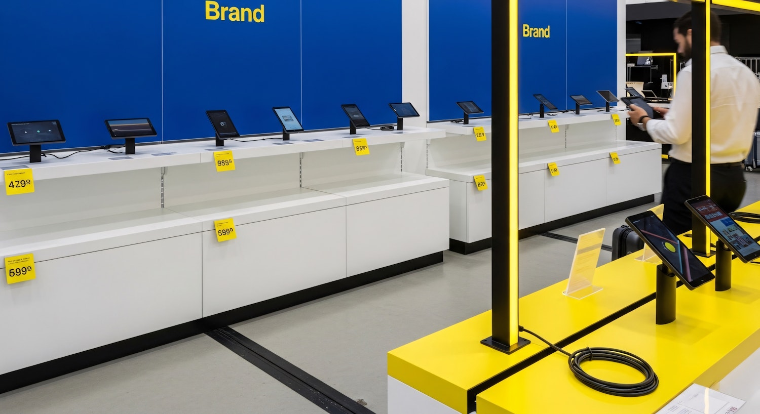 Modern retail store showcasing tablets on sleek white and yellow counters, with a customer browsing in the background.