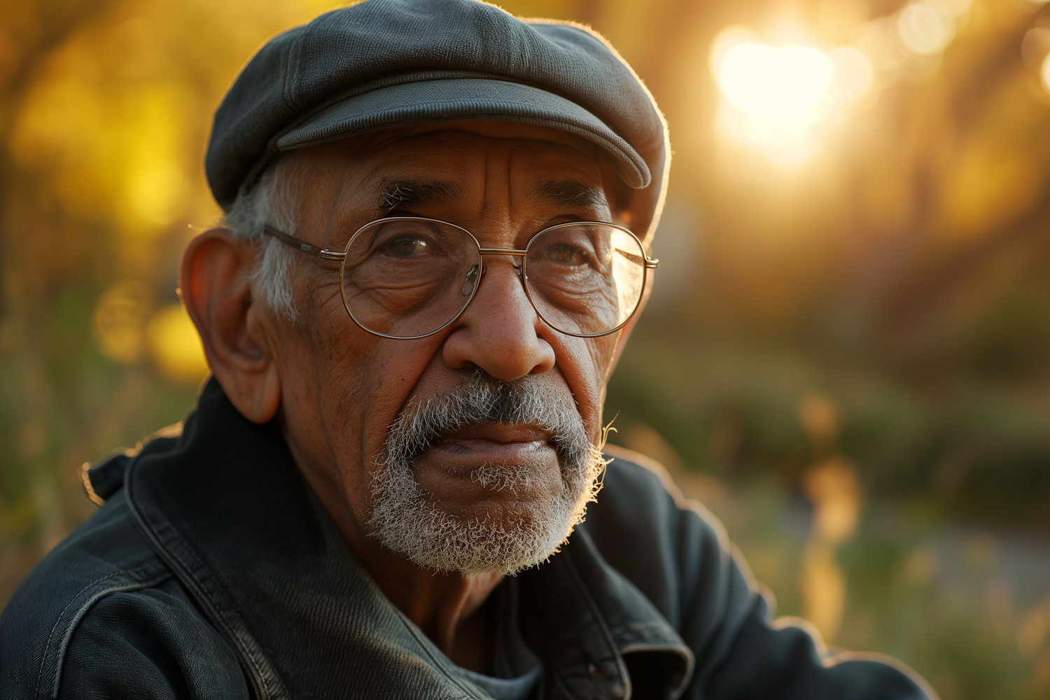 Elderly man with glasses and a flat cap, bathed in warm sunset light, exudes a contemplative and serene expression.