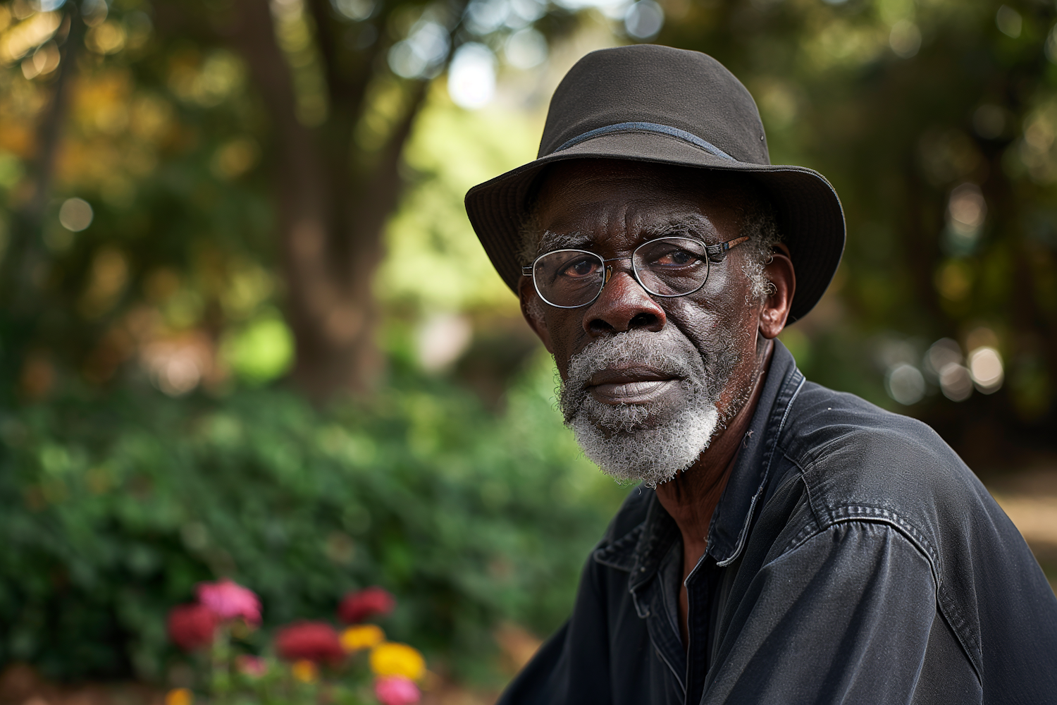 Elderly man with glasses and hat in a garden, surrounded by colorful flowers and greenery, exuding a contemplative mood.