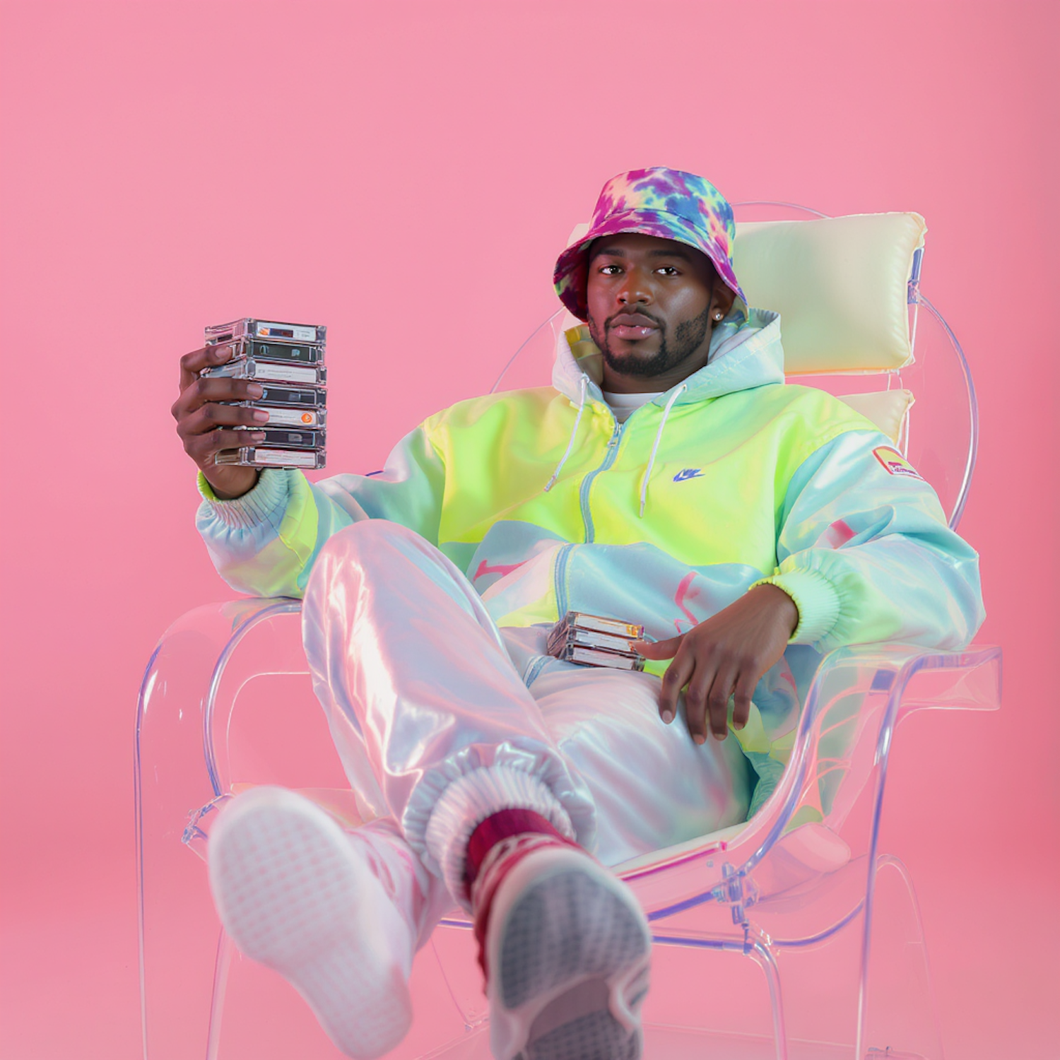 Stylish man in a neon jacket and tie-dye hat holding cassette tapes, seated on a clear chair against a vibrant pink background.