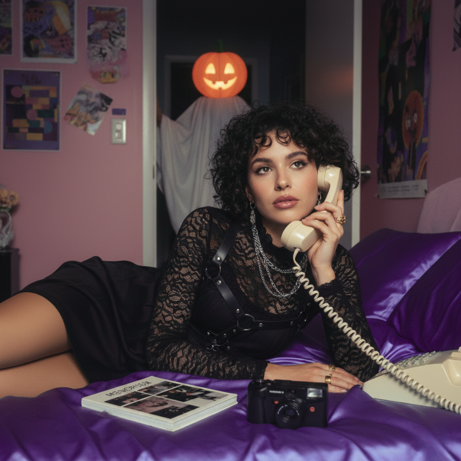 A stylish woman in a retro-themed room with a spooky pumpkin-headed figure in the background, creating a playful and nostalgic vibe.
