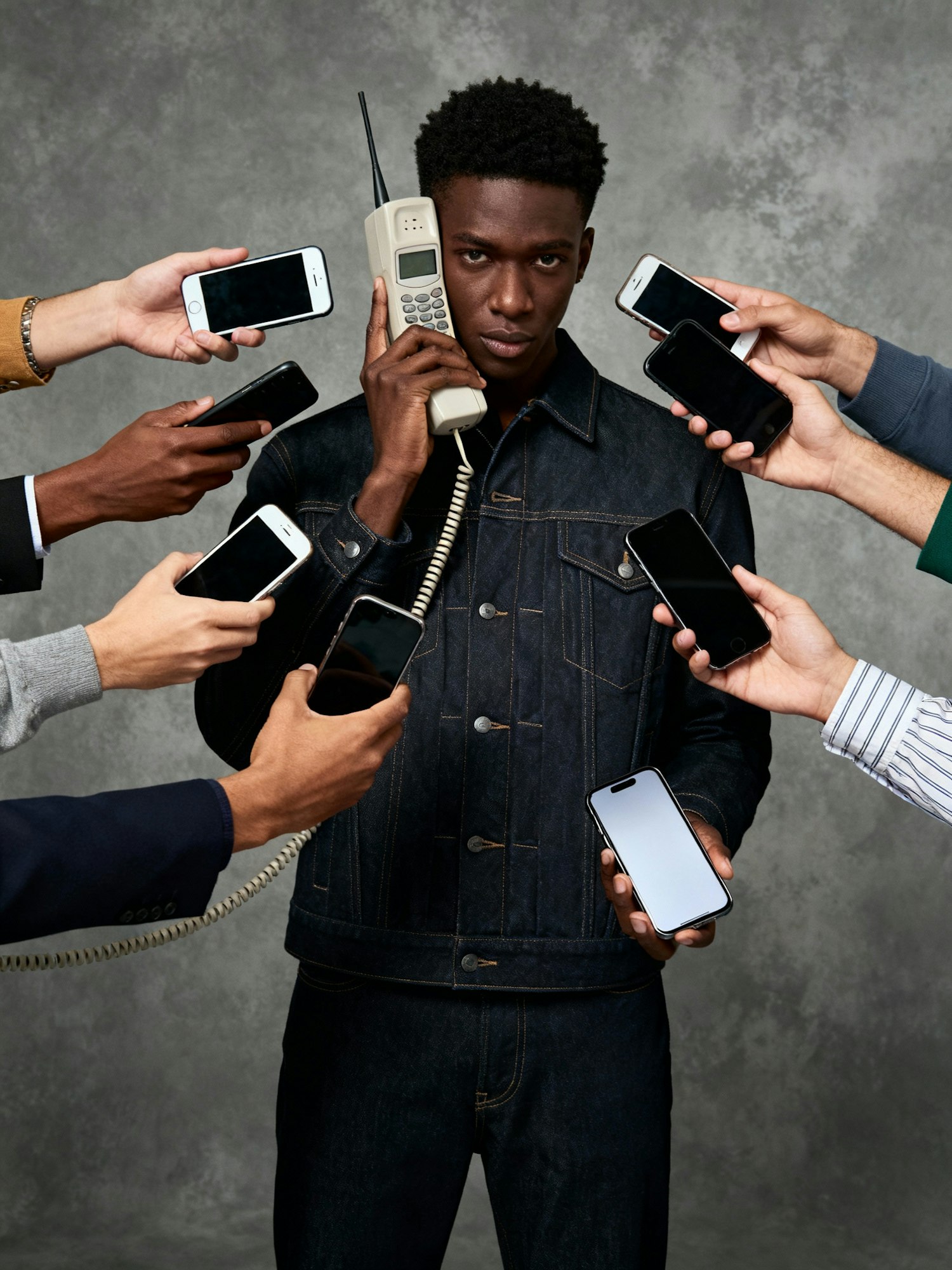 A conceptual editorial portrait of a Black individual wearing a dark denim outfit, standing against a textured gray studio backdrop. The subject holds a large vintage mobile phone to one ear with one hand, and a sleek modern smartphone in the other, symbolizing the tension between past and present communication. Surrounding the subject are multiple disembodied hands of varied skin tones and sleeve styles, each holding a mobile phone pointed toward the subject’s face, creating a sense of digital overwhelm and hyperconnectivity. The lighting is soft and even, casting gentle shadows that emphasize the glossy surfaces of the phones and the denim texture. The subject’s expression is partially obscured by the swarm of devices, evoking themes of identity distortion, surveillance, and technological saturation. The mood is introspective, chaotic, and visually striking, blending fashion with social commentary.
