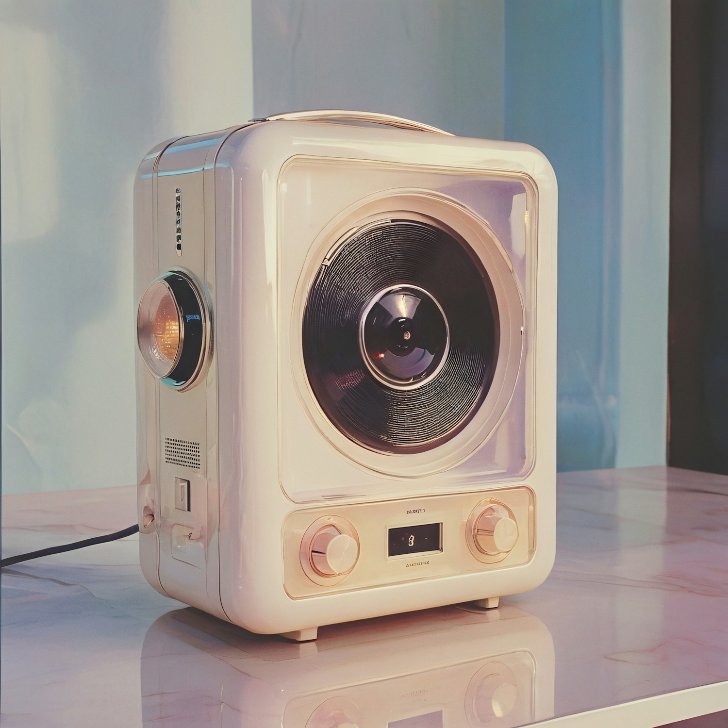 Retro-styled appliance with a vinyl-like speaker, rotary knobs, and digital display on a marble surface, evoking vintage nostalgia.
