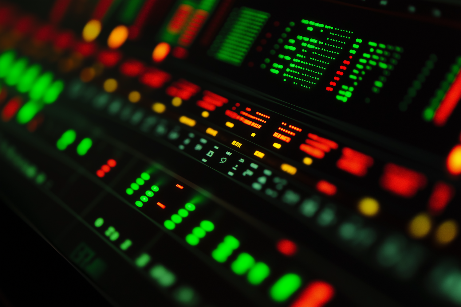 Vibrant close-up of a retro audio mixing console with glowing green, red, and yellow LED lights, perfect for music or tech enthusiasts.