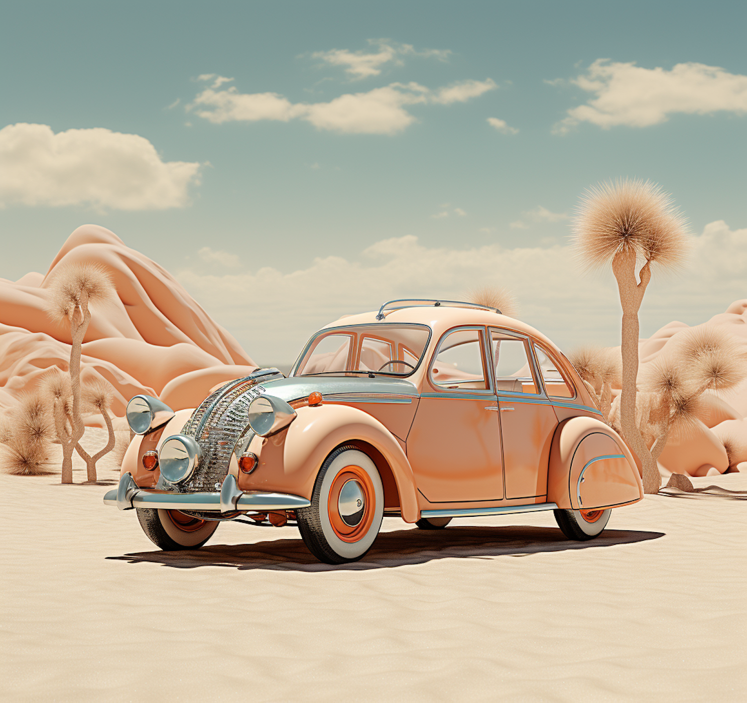 Vintage peach car in a surreal desert landscape with sandy dunes and spiky vegetation under a clear blue sky.