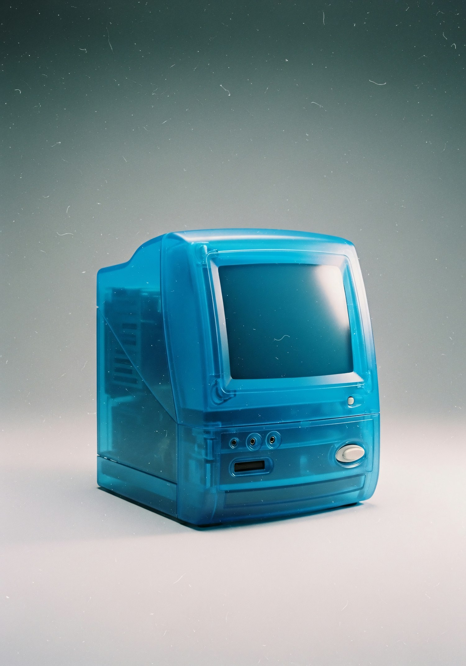 A retro translucent blue computer with a CRT screen and visible internals, showcasing a vintage yet modern aesthetic.