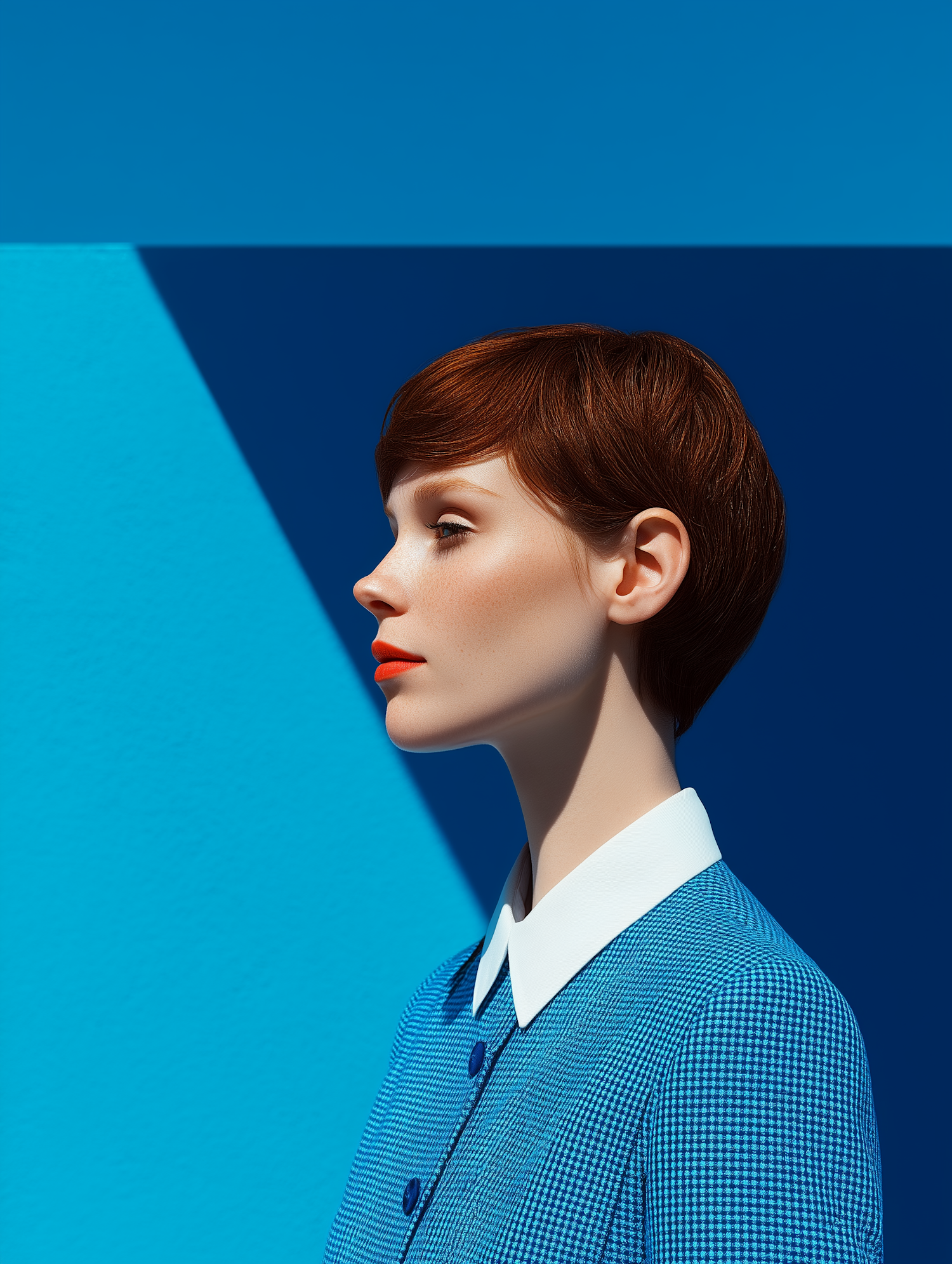 Stylish woman in a retro blue dress with a white collar, short auburn hair, and bold red lipstick against a vibrant blue background.