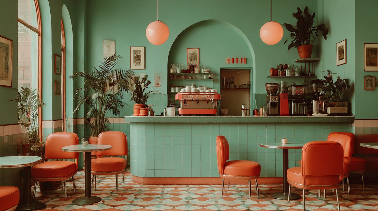 A retro-style café with teal walls, orange chairs, geometric tiles, and a cozy ambiance enhanced by plants and warm lighting.