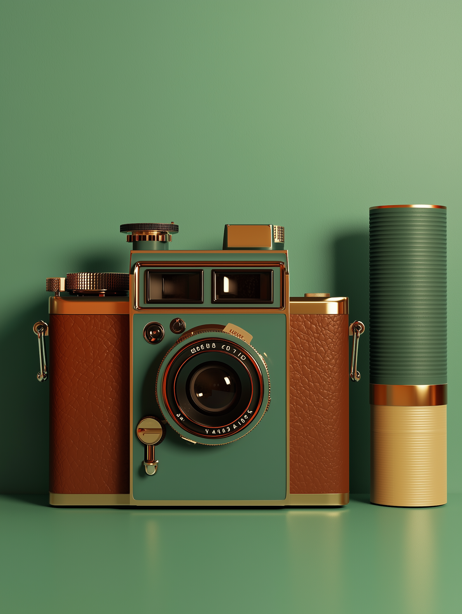 Luxurious retro-style camera with green, brown, and gold accents, paired with a matching cylindrical accessory on a green backdrop.