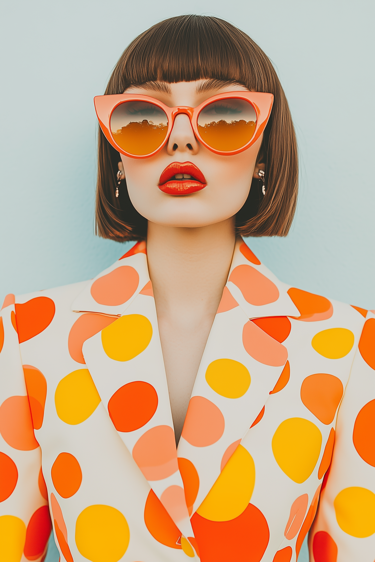 Chic woman in a polka-dot blazer, bold orange sunglasses, and red lipstick, exuding retro vibes against a light blue backdrop.