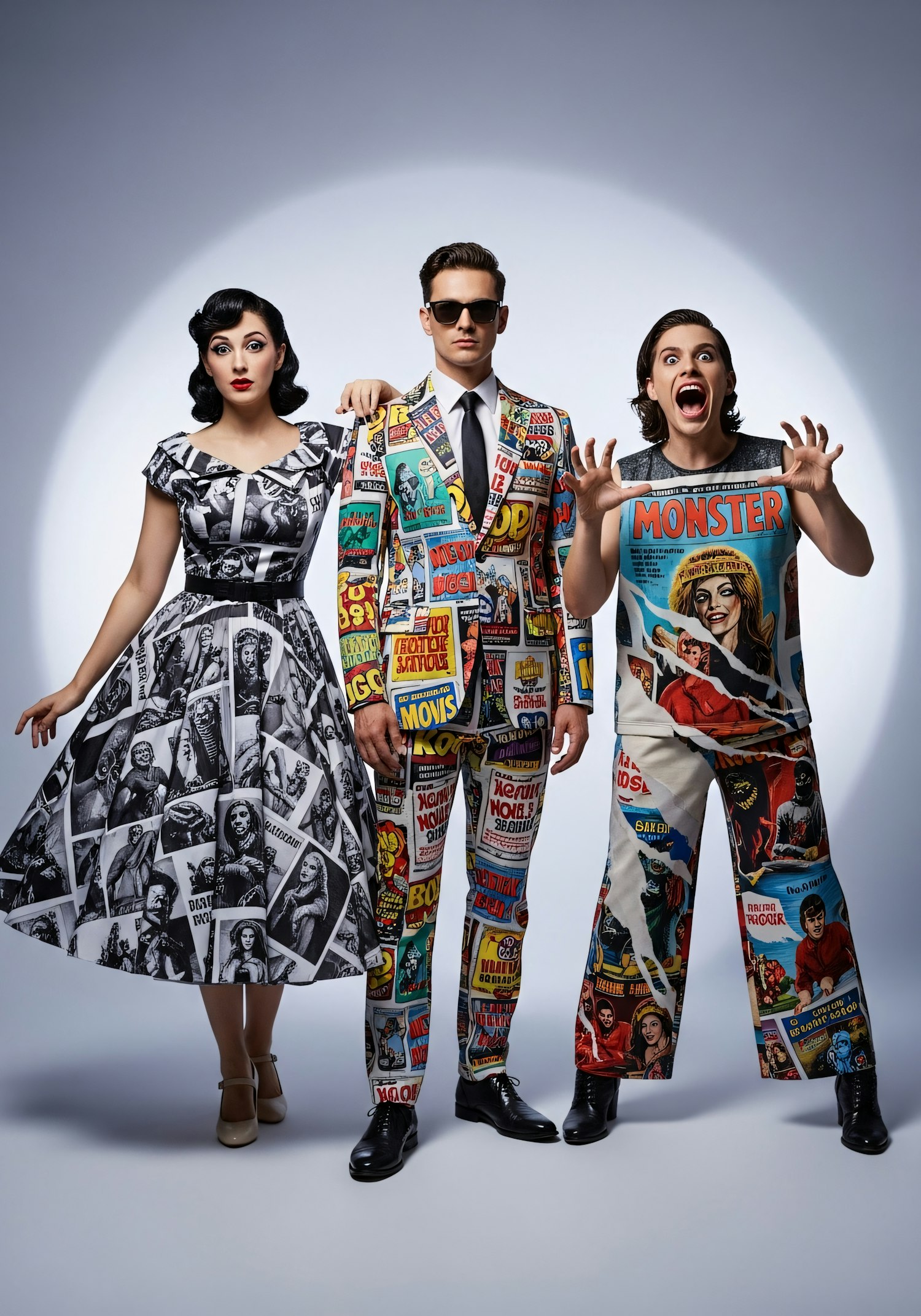 Three individuals in retro comic-themed outfits, showcasing bold prints and vibrant designs, set against a neutral background.