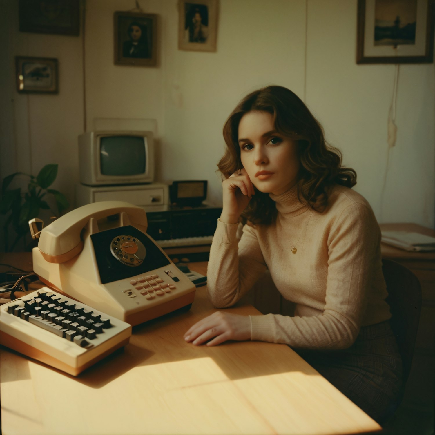 Young woman in a retro office setting with vintage phone and computer, exuding a nostalgic 70s vibe.