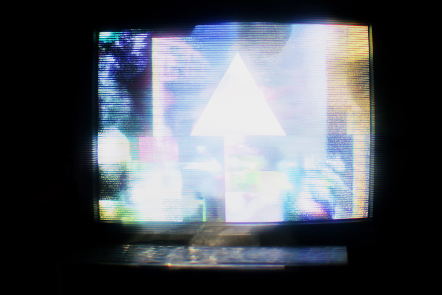 Vintage television screen displaying glitch pixel background image and distorted CRT lines within a dimly lit room.