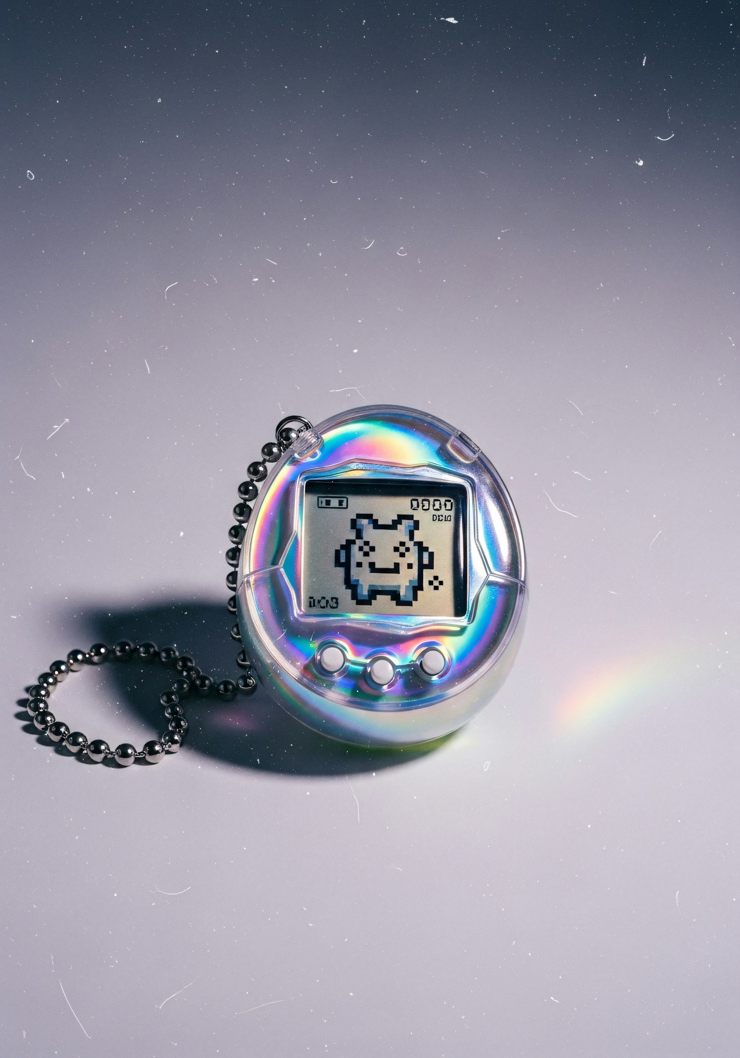 A holographic digital pet device with a pixelated character on its screen, set against a soft gradient background with a rainbow effect.