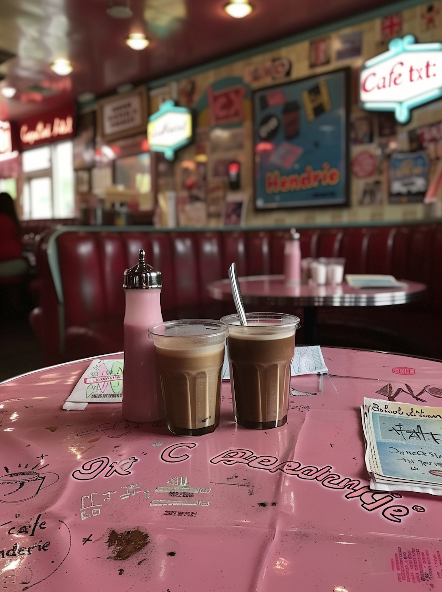 Retro diner scene with pink table, coffee glasses, and vintage decor. Cozy atmosphere with neon signs and red leather booths.