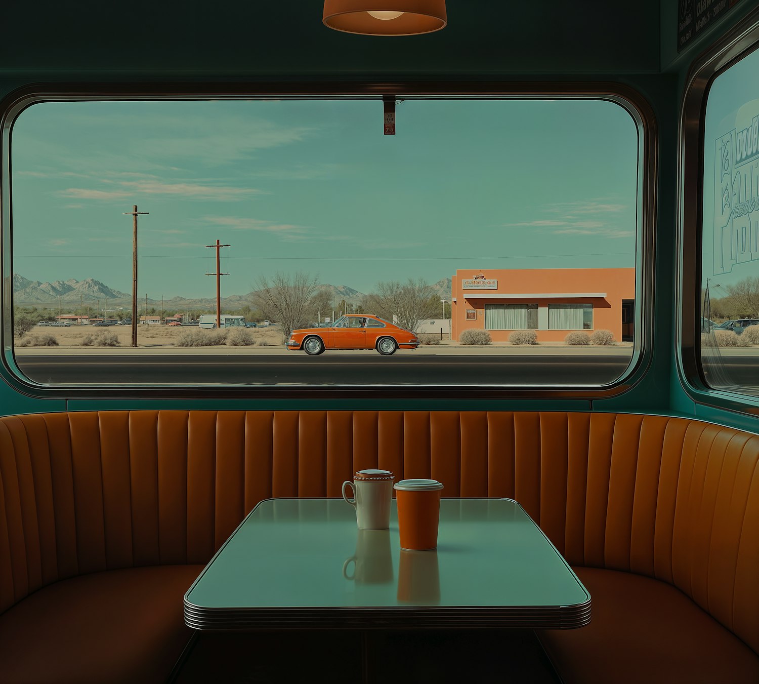 Retro diner booth with orange seating, teal table, and a scenic desert view featuring a vintage orange car and mountains in the distance.